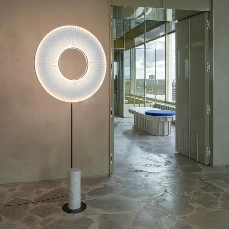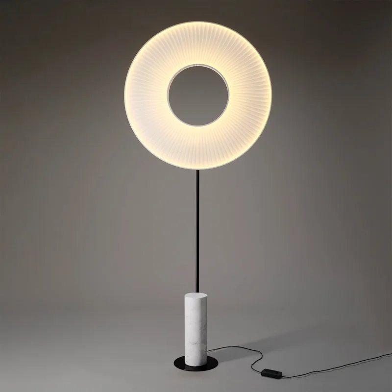 Das Herzstück dieser außergewöhnlichen Stehleuchte bildet der weiße Leuchtenschirm aus feinem Polyestertaft. Er schwebt majestätisch über einem schlanken Stab, der in einem edlen Marmorsockel mündet. Diese Kombination verleiht der Leuchte nicht nur eine beeindruckende Stabilität, sondern auch eine skulpturale Präsenz, die selbst unbeleuchtetet fasziniert. Der Marmorsockel, wahlweise in klassischem Weiß oder elegantem Schwarz erhältlich, setzt einen luxuriösen Akzent und unterstreicht den hochwertigen Charakter der Leuchte.