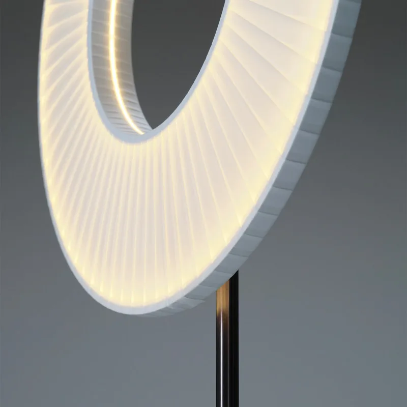 Die sanft geschwungenen Linien und weichen Kurven des Schirms erzeugen ein faszinierendes Spiel aus Licht und Schatten. Hier verschmelzen modernste LED-Technologie und poetische Designsprache zu einer perfekten Einheit. Das Licht wird durch die anmutigen Formen sanft gestreut und schafft eine warme, einladende Atmosphäre – ideal für Wohnzimmer, Schlafzimmer oder repräsentative Empfangsbereiche.