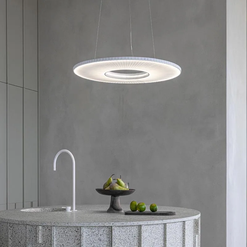 Die LED-Pendelleuchte Iris Pendant Horizontal 80 von 10 HEURES 10 ist die perfekte Wahl für alle, die ihren Esstisch oder ihre Kochinsel mit einem atemberaubenden Lichtobjekt krönen möchten. Mit ihrem imposanten Durchmesser von 78 cm schwebt sie wie eine leuchtende Skulptur über dem Zentrum Ihres Wohn- oder Küchenbereichs und verwandelt alltägliche Mahlzeiten in stilvolle Dinner-Partys. Der flache, weiße Leuchtenschirm aus Polyestertaft, der an filigranen Kabeln vom Baldachin abpendelt, verströmt ein sanftes, blendfreies Licht, das ideal für gemütliche Abendessen oder konzentriertes Arbeiten an der Kücheninsel ist.