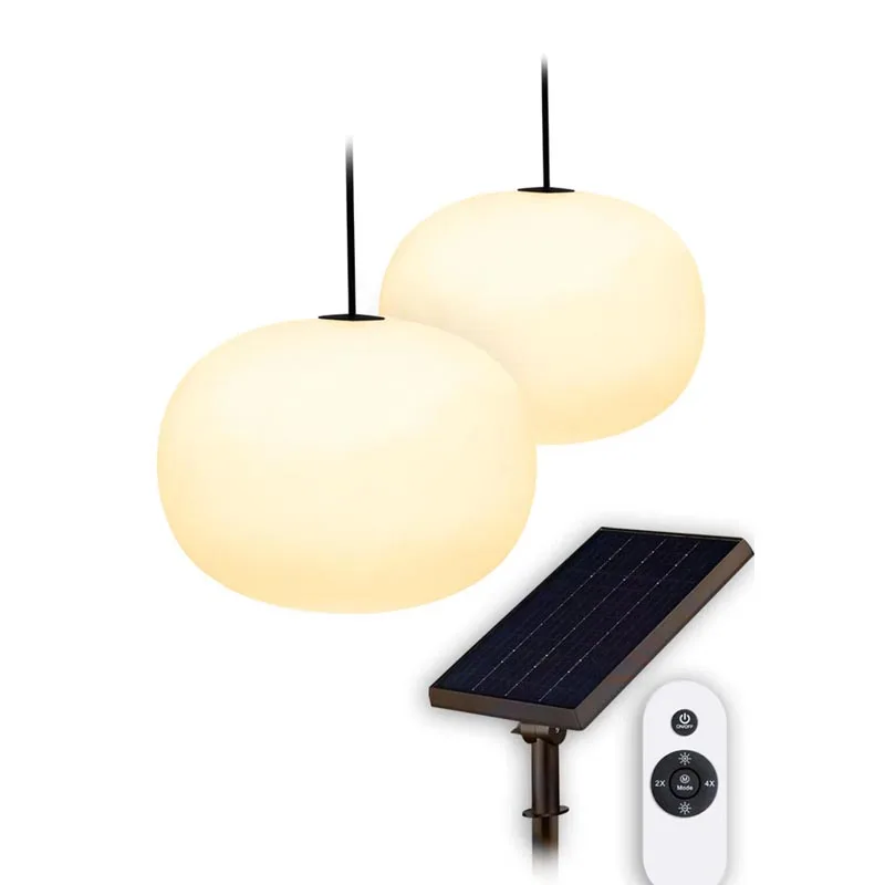 Die beiden Hängelampen sind über ein 200 cm langes Kabel miteinander verbunden und lassen sich dank integrierter Ösen ganz einfach an Haken, Geländern oder Pergola-Konstruktionen anbringen. Mit einer Höhe von 71,7 cm und einem Durchmesser von 23 cm setzen sie stilvolle Lichtakzente – unabhängig von festen Stromquellen.