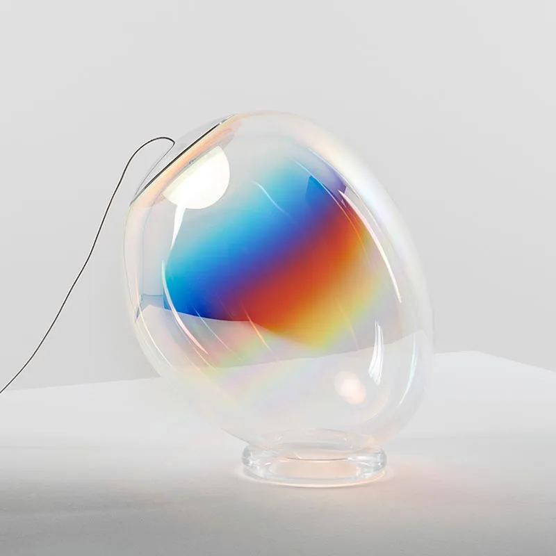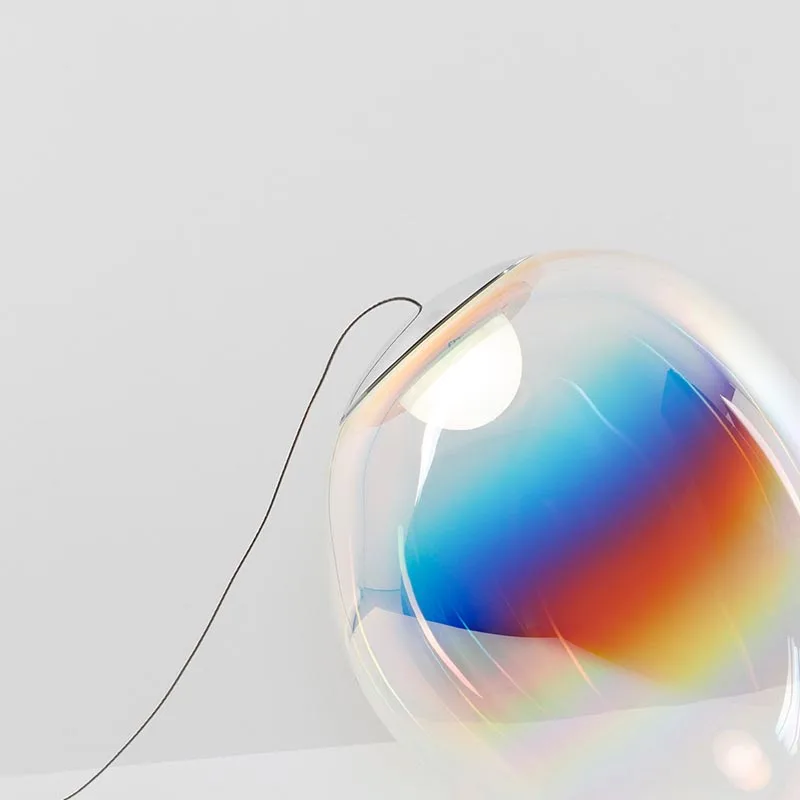 Der mundgeblasene Diffusor, der in traditioneller Handwerkskunst gefertigt wird, erhält seine unverwechselbare Form durch erneutes Erhitzen im Ofen. Dadurch wird jeder Leuchtkörper zu einem Unikat. Der schimmernde Lichteffekt, der an Seifenblasen erinnert, entsteht durch ein nachhaltiges und emissionsfreies Verfahren, bei dem ein dichroitisches Metallfinish aufgebracht wird. Das warmweiße Licht der LED wird weich in alle Richtungen abgestrahlt und sorgt so für eine einzigartige Raumbeleuchtung