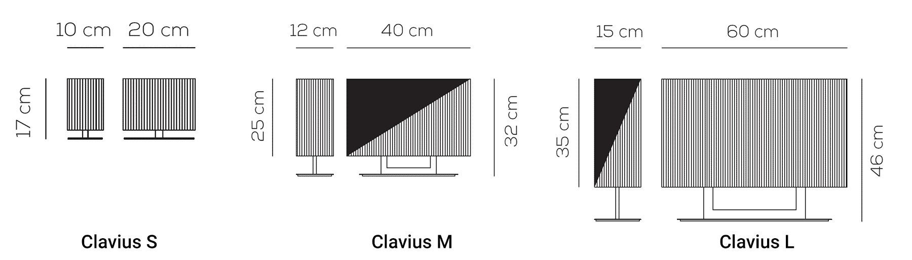 | Bestückung | Clavius S: 1 x E14 LED 6,5 W, Clavius M: 2 x E14 LED 6,5 W, Clavius L: 2 x E27 LED 17,5 W |