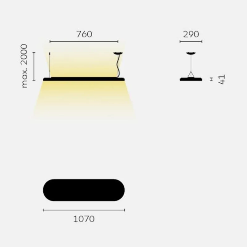 Die Pendelleuchte wird mittels eines Polyamid PA Baldachins an der Decke befestigt. Der Leuchtenschirm misst 107 cm in der Länge und 4,1 cm in der Höhe. Trotz ihrer beeindruckenden Größe wiegt die Leuchte lediglich 8 kg.