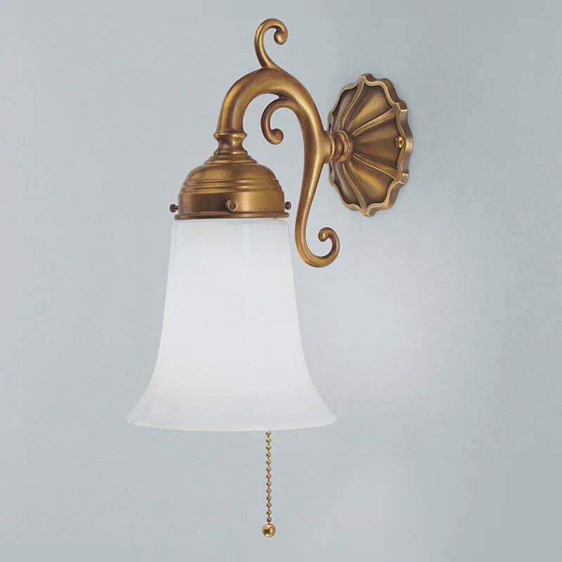 Die einflammige Wandleuchte A3036 op B von Berliner Messinglampen ist eine exzellente Wahl, um einen Hauch von Klassik und Wärme in Ihr Interieur zu bringen. Ideal geeignet als stilvolle Ergänzung neben dem Bett im Schlafzimmer sorgt diese Leuchte für einladende und entspannende Lichtverhältnisse. Der Schirm der Lampe, in eleganter Tulpenform und aus weiß glänzendem Glas gefertigt, verteilt das Licht sanft und gleichmäßig, was die Atmosphäre im Raum sofort heimeliger und einladender macht. Das von Jugendstil inspirierte Design ist nicht nur funktional, sondern auch ein wahrer Blickfang, der mit seinen sorgfältig gestalteten Verzierungen und dem runden Wandsockel jedes Zimmer verschönert. Eine praktische Zugschnur erleichtert das Ein- und Ausschalten der Lampe, was sie perfekt für Bereiche macht, in denen Komfort und Stil Hand in Hand gehen sollen.