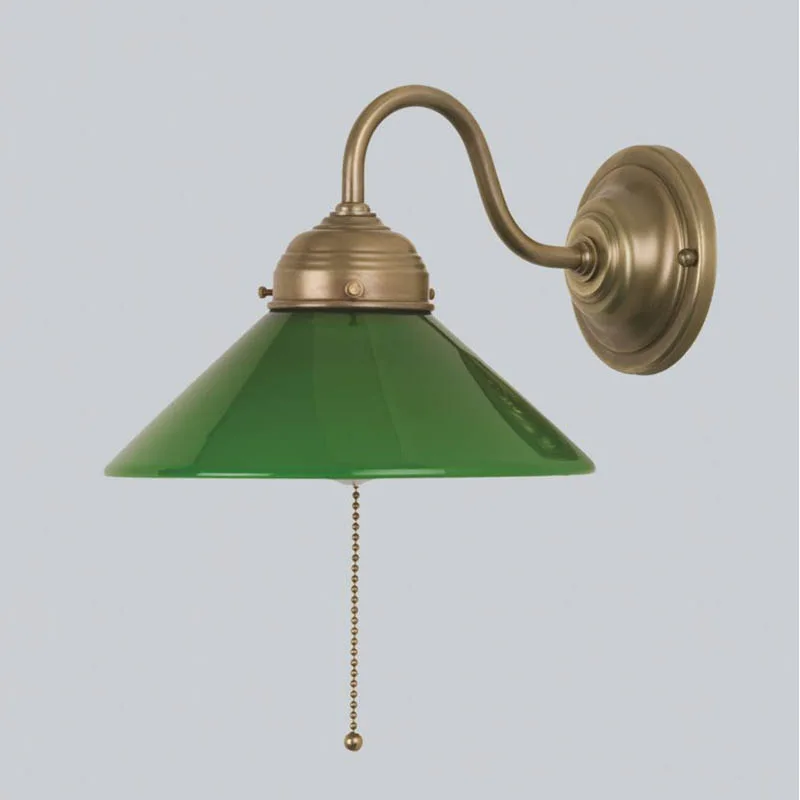 Die Wandleuchte A8-17 gr B von Berliner Messinglampen ist die perfekte Wahl für alle, die ihre Wohn- und Schlafräume oder Flure mit einer Kombination aus stilvollem Design und sanfter Beleuchtung aufwerten möchten. Mit ihrem Finish aus Berliner Messing und einem eleganten, mundgeblasenen, grün glänzenden Opalglas-Schirm verteilt diese Lampe das Licht weich im Raum, was eine warme und einladende Atmosphäre schafft. Die klassische Kegelform des Schirms sorgt für eine effiziente Lichtstreuung, ideal für die Lektüre oder andere Aktivitäten, die eine fokussierte Beleuchtung erfordern.