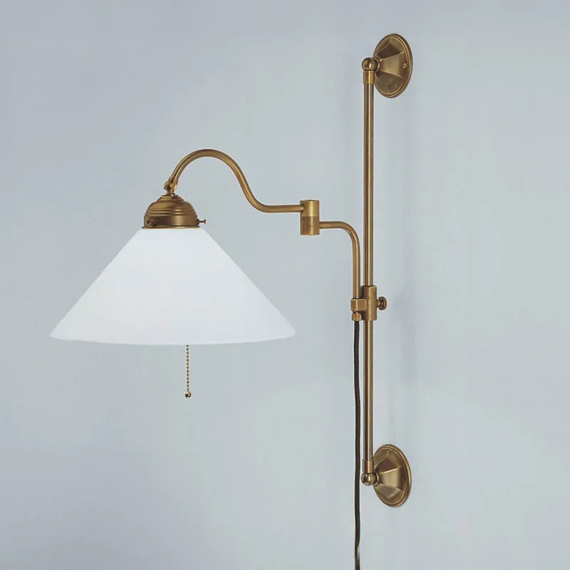 Die Wandleuchte A80-70 op B von Berliner Messinglampen ist eine exzellente Wahl für all jene, die eine vielseitige und stilvolle Beleuchtungslösung suchen. Mit ihrem Finish aus edlem Berliner Messing und einem Schirm aus mundgeblasenem, weiß glänzendem Opalglas sorgt diese Lampe für eine sanfte Lichtverteilung, die jeden Raum – sei es Wohn- oder Schlafzimmer, oder auch den Flur – in ein warmes, einladendes Licht taucht. Die Lampe zeichnet sich durch ihre funktionalen Anpassungsmöglichkeiten aus: Der Leuchtenarm ist höhenverstellbar und schwenkbar, und der Leuchtenschirm lässt sich neigen, um die Lichtausrichtung nach Bedarf zu justieren.