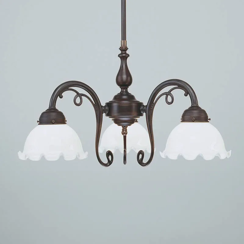 Mit seinen drei weiß glänzenden Lampenschirmen, die in einer sanft wellenförmigen Glockenform gestaltet sind, verteilt dieser Kronleuchter das Licht weich und gleichmäßig im Raum und schafft eine einladende, warme Atmosphäre. Die kunstvoll geschwungenen Arme des Kronleuchters fügen eine elegante Note hinzu, die sowohl in traditionelle als auch in zeitgenössische Dekors passt. Nutzen Sie dieses wunderschön gestaltete Beleuchtungselement, um jedem Raum eine besondere und stilvolle Note zu verleihen, die Gäste und Bewohner gleichermaßen beeindruckt.