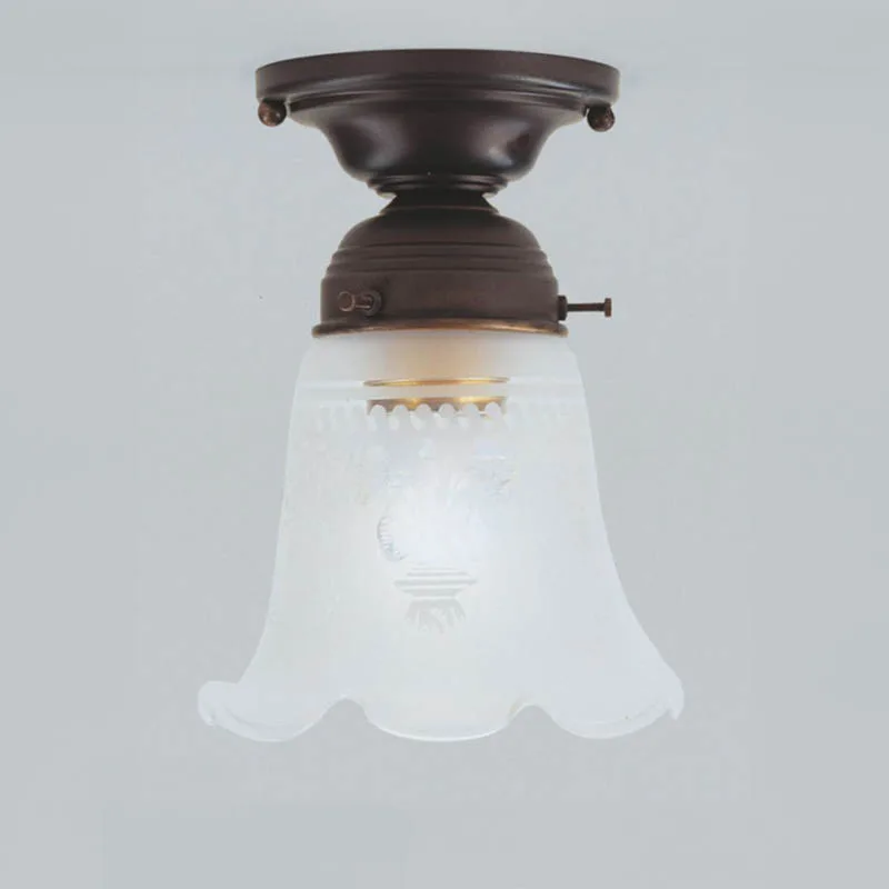 Die fein gearbeitete Struktur des Lampenschirms, verziert mit zarten Ätzungen, fängt das Licht auf eine Weise ein, die sowohl funktional als auch ästhetisch ansprechend ist. Diese Deckenleuchte ist ideal, um eine warme, einladende Atmosphäre zu schaffen, die von einer sanften und blendfreien Beleuchtung begleitet wird. Ihre elegante Form und der detailreiche Schirm machen sie zur perfekten Wahl für Räume, die einen Touch von Vintage-Eleganz benötigen.