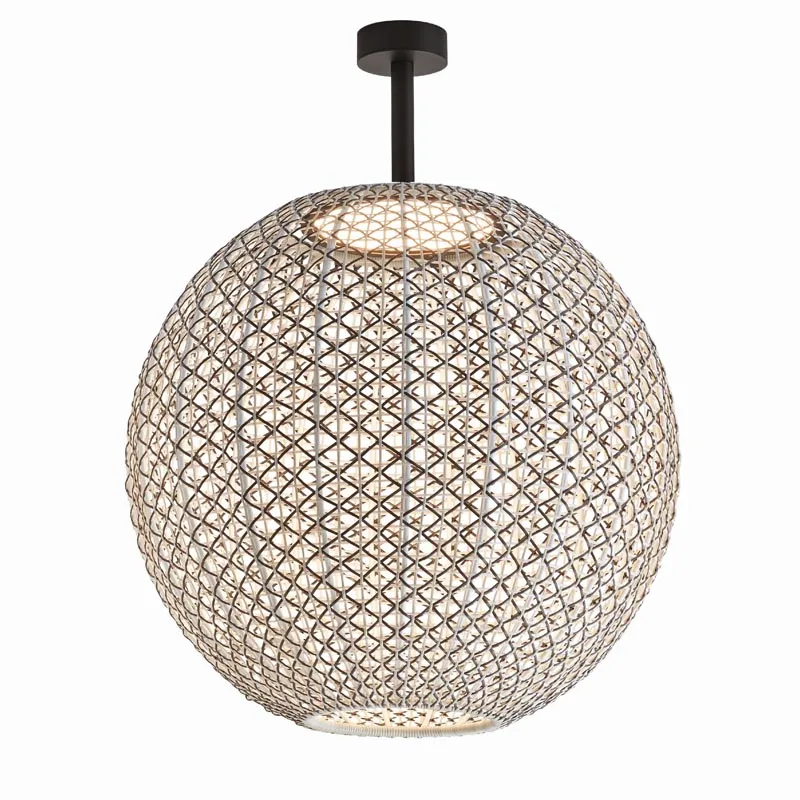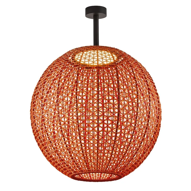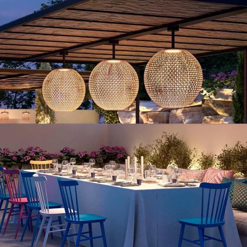 Nans Sphere PF/80 ist eine moderne LED-Deckenleuchte, die mit ihrer warmen Ausstrahlung sommerliches Flair in Außenbereiche bringt. Nans Sphere PF/80 Outdoor ist gegen Stahlwasser (IP65) geschützt und kann auch an ungeschützten Bereichen ohne Überdachung eingesetzt werden. Die Deckenleuchte im mediterranen Look ist mit einer energieeffizienten LED ausgestattet, die das Licht durch einen UV-beständigen Polyethylendiffusor sanft nach unten abstrahlt. Durch die offene Struktur entsteht eine besonders harmonische Lichtatmosphäre. Individuelle Farbvarianten in Rot, Beige und Braun bieten vielfältige Möglichkeiten der Außengestaltung.