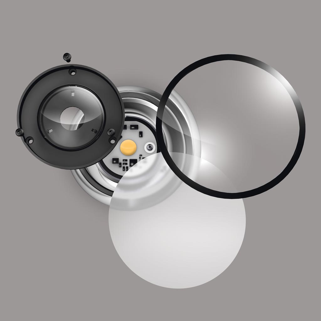 Im Inneren arbeitet eine moderne Hochvolt-LED, die für ein angenehm warmweißes, farbechtes Licht sorgt. Drei wählbare Abstrahlwinkel bieten maximale Flexibilität für individuelle Lichtkonzepte: