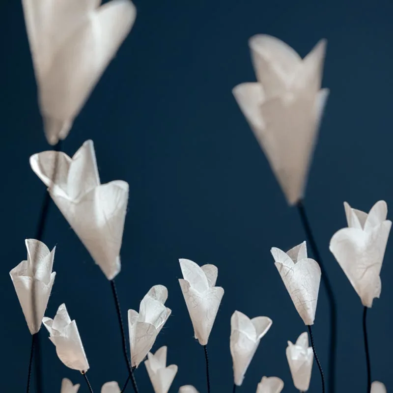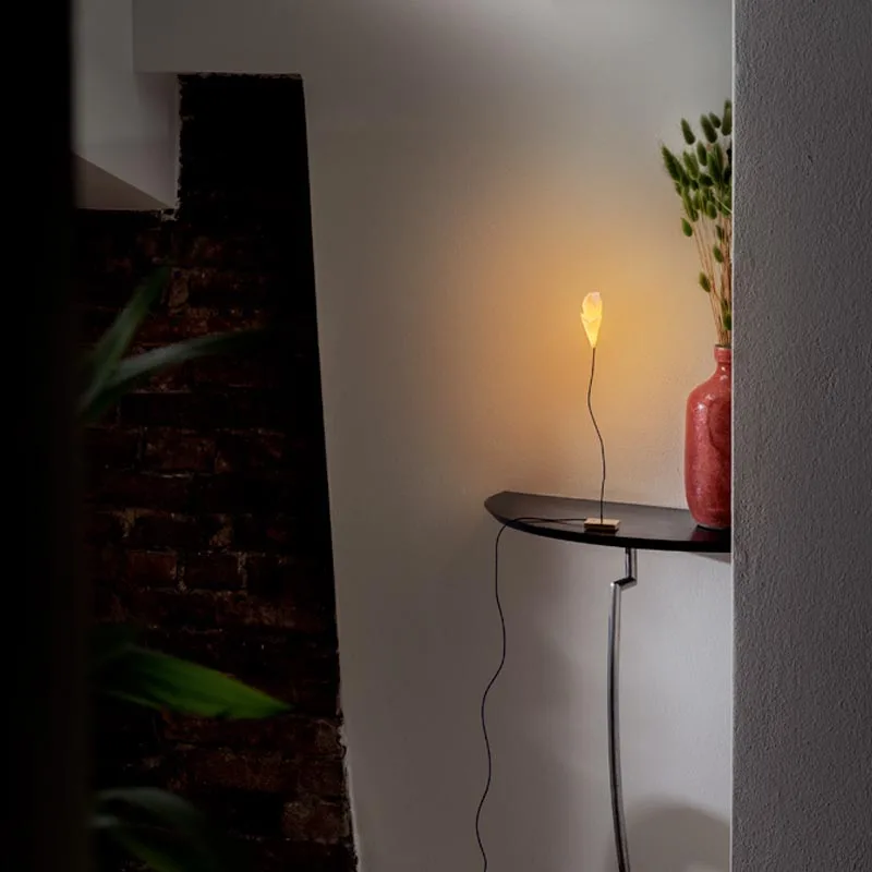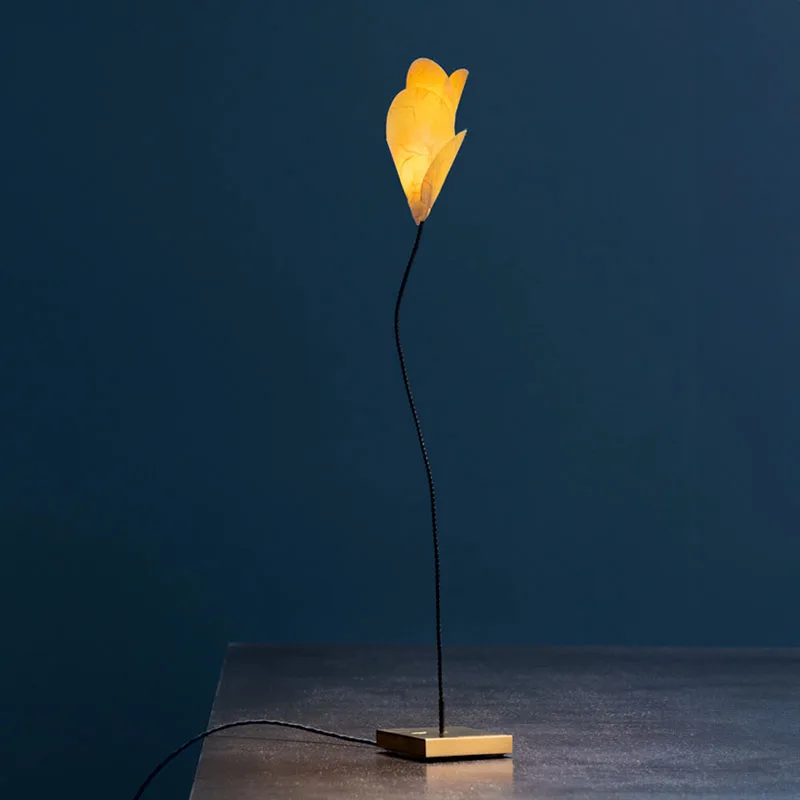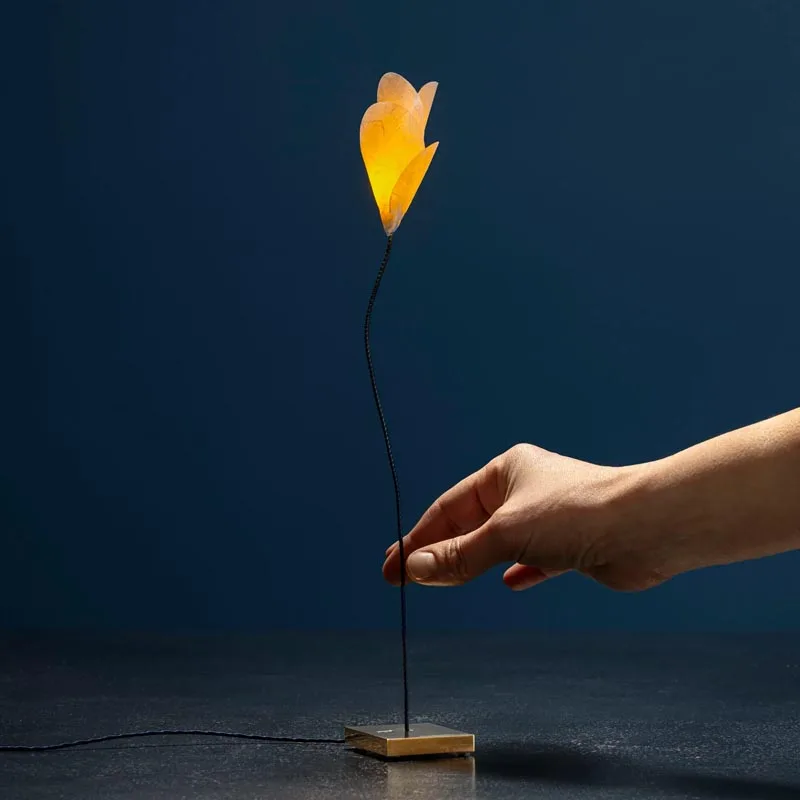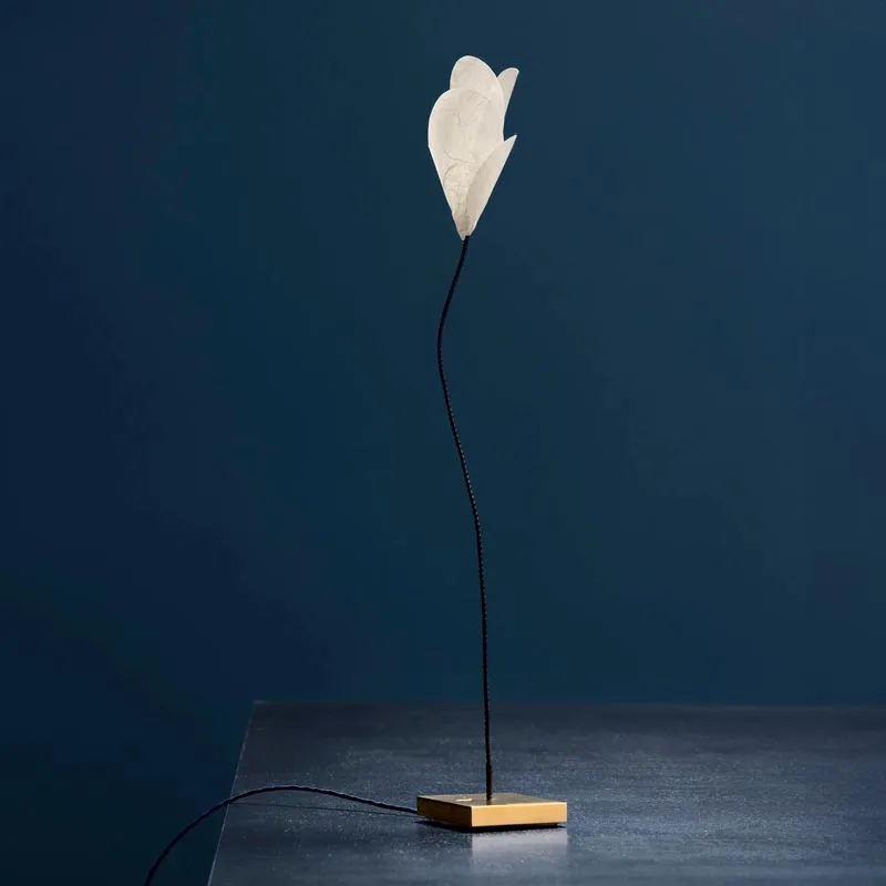 Die “For You” LED-Tischleuchte von Catellani & Smith ist eine Hommage an die Schönheit der Natur, verpackt in modernem Design. Inspiriert von der Leichtigkeit einer Wildblume, verbindet die Leuchte feine Handwerkskunst mit fortschrittlicher Beleuchtungstechnologie. Die Basis aus poliertem Messing verleiht der Leuchte Stabilität und Eleganz. Der flexible, mit blauem Stoff umwickelte Stiel lässt sich individuell formen, wodurch jede Leuchte zum Unikat wird. Die zarten Blütenblätter aus Reispapier, die leicht ausgetauscht werden können, umhüllen eine dedizierte LED-Platine, die warmes Bernsteinlicht ausstrahlt.