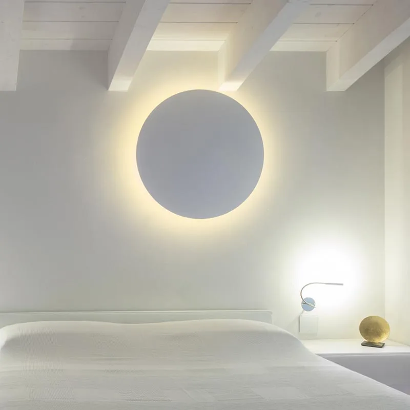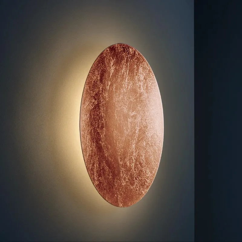 Francesca ist kreisrunde Wandleuchte der italienischen Lichtmanufaktur von Catellani & Smith. Die erlesene Kreation von Enzo Catellani überträgt das raffinierte Konzept der Lichtbrechung und die Betrachtung der Lichtfarbe, das in der bekannten Leuchtenfamilie Luce d’Oro präsentiert wurde, auf einzigartige Weise in ein dekoratives Designstück und erschafft so ein erlesenes Lichtobjekt, das Wände mit einem kreisrunden Lichtschein stimmungsvoll in Szene setzt und so für eine außergewöhnliche Atmosphäre sorgt. Francesca besteht aus einem runden Reflektor aus Fiberglas, der in vier eleganten Finishes Gold, Kupfer, Silber oder Weiß erhältlich ist. Die Leuchte wird auf der Rückseite mit 8 energieeffizienten E27 LED-Lampen bestückt, die das Licht an die Wand strahlen und von dort als indirektes Licht reflektiert werden. Je nach Ausführung ist der Reflektor auf der Rückseite entweder mit Gold-, Silber- oder Kupferfolie bestückt. Die Wandleuchte ist mit einem Durchmesser von 80 cm oder 120 cm erhältlich. Über einen externen Triac- oder Phasenabschnittdimmer kann die Lichtintensität eingestellt werden.