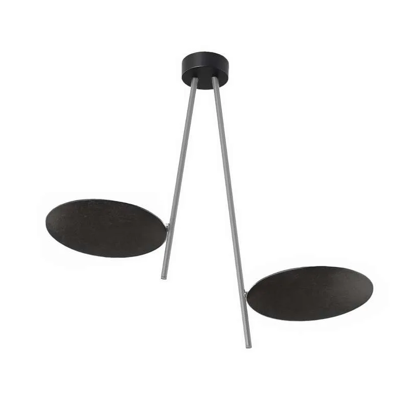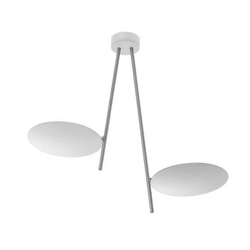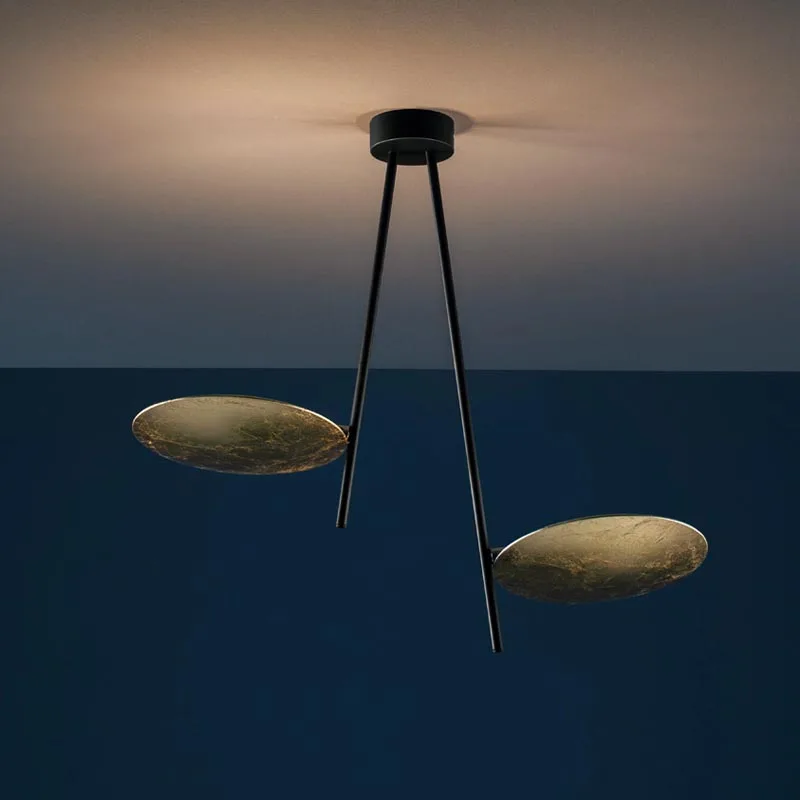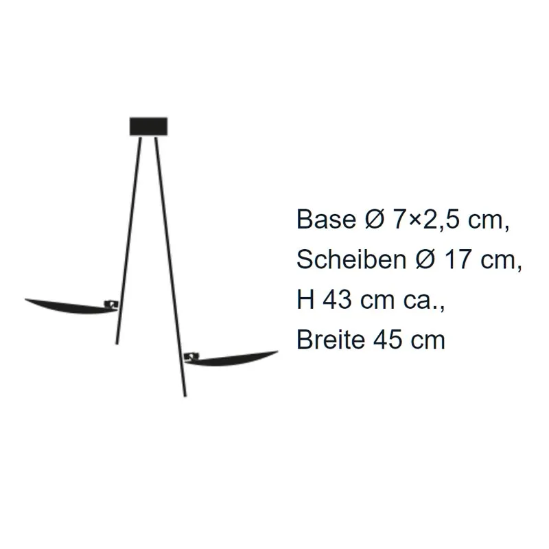 Die Leuchte besteht aus zwei Aluminiumscheiben, die über filigrane Arme mit einem Gelenk verbunden sind. Diese Konstruktion ermöglicht es, die beiden Reflektoren individuell auszurichten. Sie können das Licht je nach Bedarf nach unten lenken, um eine blendfreie Beleuchtung zu erzeugen, oder nach oben, um diffuses Licht zu erzeugen. Dies ermöglicht eine angenehme, indirekte Beleuchtung in Wohn- und Gewerberäumen.