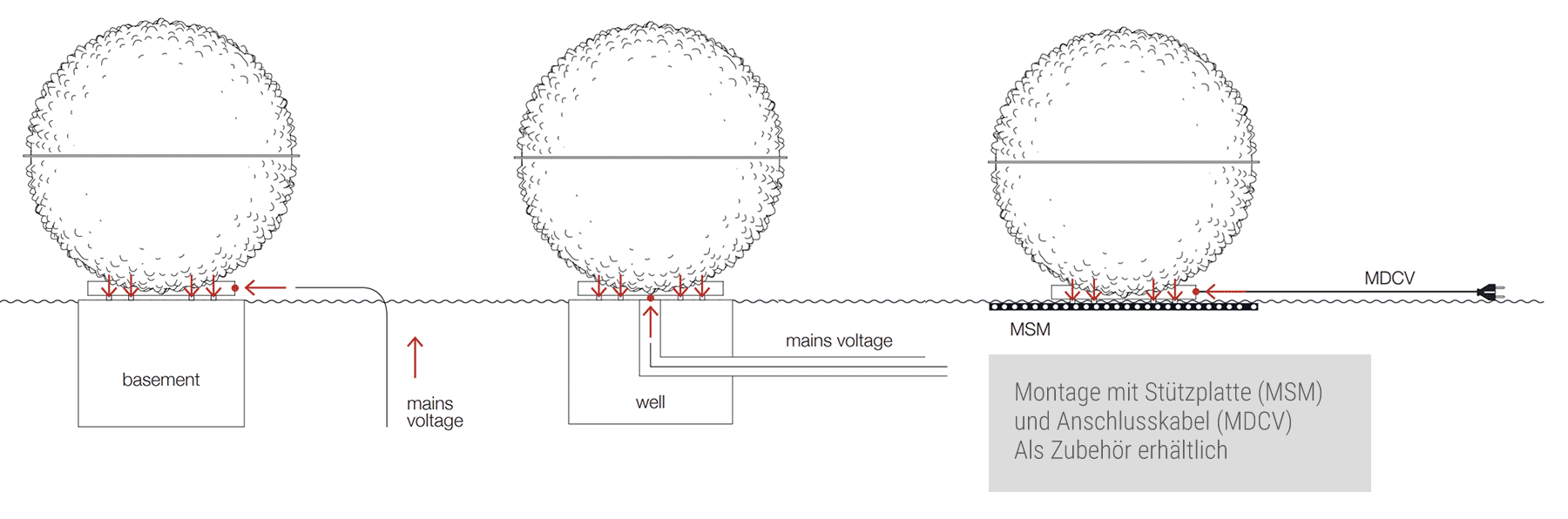 Um sicherzustellen, dass die Leuchte stabil und sicher steht, muss die Medousê F LED Bodenleuchte auf einem soliden Untergrund montiert werden. Sie kann auch mithilfe einer geeigneten Stützplatte (MSM) und einem Anschlusskabel (MDCV) kombiniert werden. Die beiden Artikel sind als zusätzliches Zubehör erhältlich.