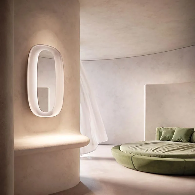 Die Korum Parete von Cini & Nils ist eine stilvolle Wandleuchte, die vom renommierten Designer Karim Rashid entworfen wurde. Mit ihrem flachen, ovalen Schirm aus hochwertigem Kunststoff verkörpert sie ein modernes, futuristisches Design, das sich nahtlos in minimalistische und zeitgenössische Wohnstile einfügt.