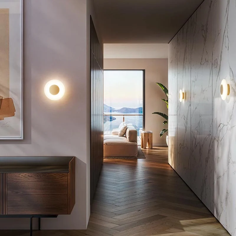 Der opalweiße Glasdiffusor wird von einem dezenten, kreisförmigen Element ergänzt, das nicht nur als gestalterisches Detail dient, sondern gleichzeitig das Licht sanft filtert. So entsteht eine blendfreie, indirekte Lichtwirkung, die Räume in ein angenehmes, ausgewogenes Licht taucht und eine ruhige, wohnliche Atmosphäre schafft.