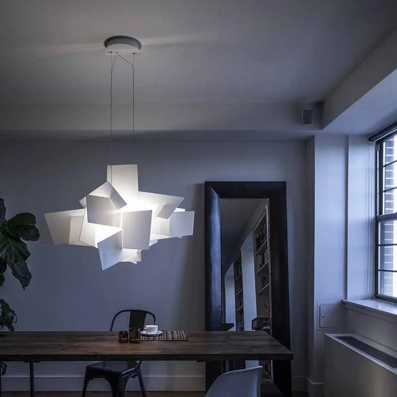Das Licht wird von den einzelnen Platten reflektiert und sorgt für eine angenehm diffuse, blendfreie Beleuchtung des Raumes. Die Big Bang ist nicht nur ein Beleuchtungskörper, sondern ein architektonisches Element, das Oberflächen, Licht und Schatten zu einer eindrucksvollen Komposition vereint. Als Mittelpunkt eines Raumes zieht sie unweigerlich alle Blicke auf sich und wird zum echten Hingucker. Dank ihrer vielseitigen Einsetzbarkeit findet die Leuchte sowohl in privaten Wohnräumen als auch in öffentlichen Bereichen ihren Platz und verleiht jedem Ambiente eine besondere Note.