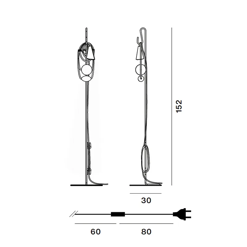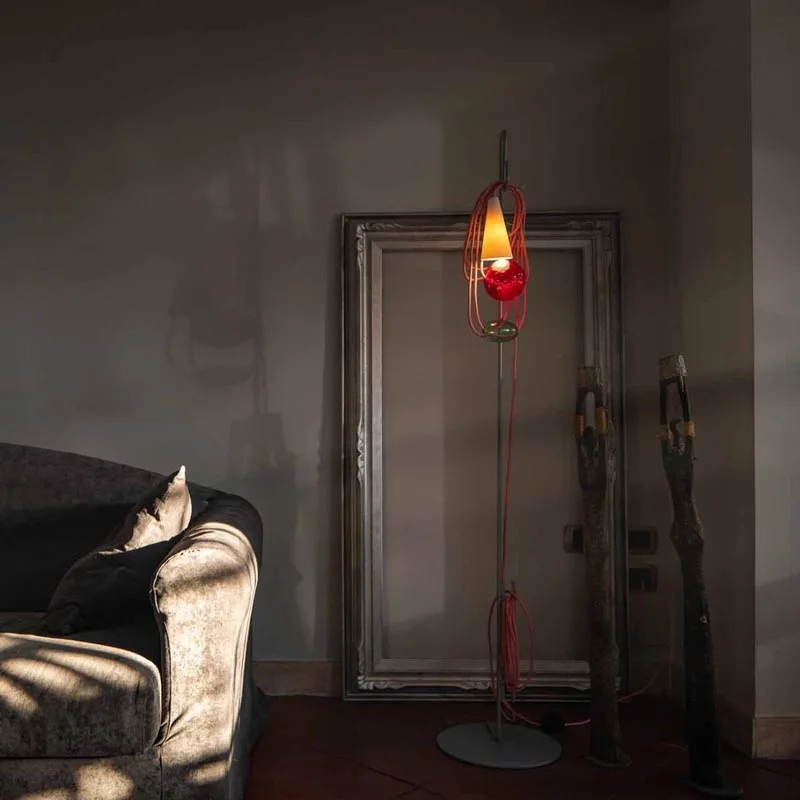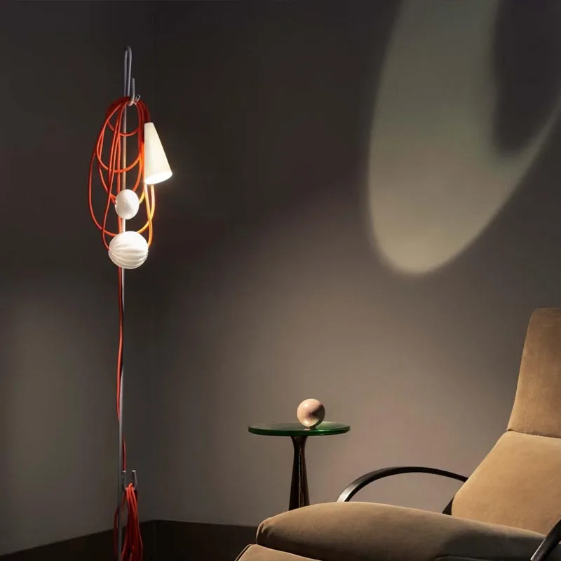 Das auffälligste Merkmal der Leuchte ist zweifellos das gewundene Textilkabel, das lässig auf einer Metallhalterung drapiert ist und maßgeblich zu ihrem charakteristischen Erscheinungsbild beiträgt. Im Kontrast dazu steht der schlanke, konische Porzellanschirm, der trotz seiner Schlichtheit eine wichtige funktionale und ästhetische Rolle spielt. Er sorgt bei eingeschalteter Leuchte für eine weiche, nach unten gerichtete Lichtstreuung. Zwei handgefertigte Kugeln aus mundgeblasenem Glas, die auf dem Kabel aufgereiht sind, verleihen dem Design zusätzliche Ausgewogenheit und visuelle Spannung. Jede dieser Kugeln ist ein Unikat, ohne feste Form geblasen und in reiner Handarbeit gefertigt.