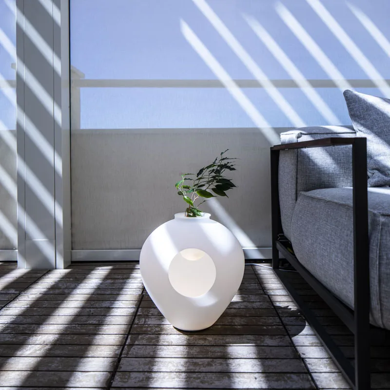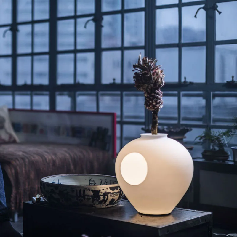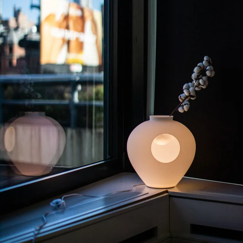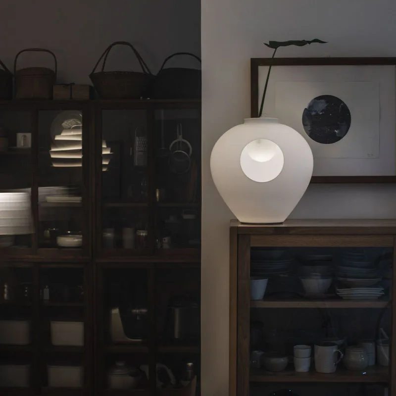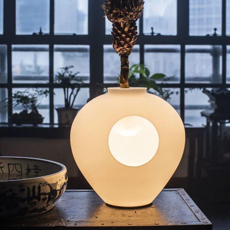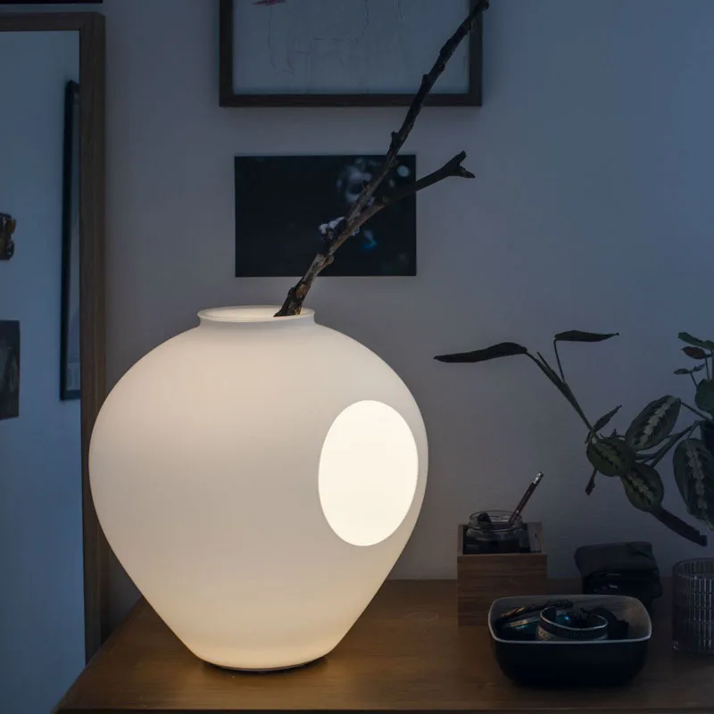 Madre ist Tischleuchte und dekorativer Einrichtungsgegenstand zugleich. Die von der Designerin Andrea Anastasio für die italienische Lichtmarke Foscarini entworfene Leuchte bringt einen Hauch Poesie in jedes Zuhause und eröffnet vielfältige Einsatzmöglichkeiten in unterschiedlichen Einrichtungsstilen. Die Leuchte besteht aus mundgeblasenem Borosilikatglas, welches das Licht angenehm weich im Raum verteilt. Eine Öffnung in der Mitte des voluminösen leuchtenden Korpus verleiht der Leuchte etwas Magisches und lässt das von außen auftreffende Licht mit dem im Inneren der Leuchte verschmelzen. Die im oberen Bereich verborgene Schale kann zudem als Vase für Zweige oder andere dekorative Gegenstände genutzt werden, um auf diese Weise schlichte und elegante Gesamtkompositionen zu gestalten. Über den Dimmer am Kabel kann die Lichtintensität an individuelle Bedürfnisse angepasst werden.