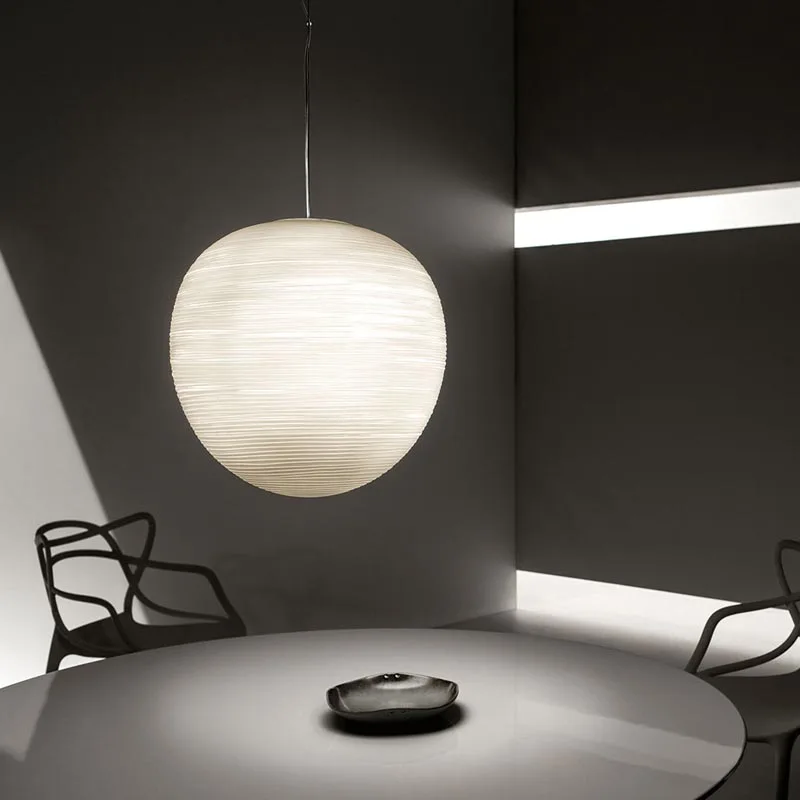 Mit einem Durchmesser von 40 cm ist Foscarini Rituals XL die größte Variante der vier zauberhaften Pendelleuchten aus der Rituals-Serie von Foscarini. Mit ihrem warmen und weichen Licht setzt sie auch große Esstische oder Wohnlandschaften stimmungsvoll in Szene. Das mundgeblasene Glas des Diffusors wurde auf kunstvolle Weise bearbeitet, um einen faszinierenden Streifeneffekt zu erzielen, der an das exotische Wagashi-Papier orientalischer Laternen erinnert. So strömt ein sanftes, diffuses Licht durch den Raum und sorgt für eine harmonische Atmosphäre. Diese Ausführung der Leuchte lässt sich mit E27-Leuchtmitteln bestücken, die über einen externen Dimmer in der Helligkeit geregelt werden können. Der Baldachin besteht aus lackiertem Metall. Das Kabel hat eine maximale Länge von 340 cm und kann je nach Bedarf gekürzt werden.  Die Leuchte ist Teil der Rituals-Leuchtenserie, die von den Designern Ludovica + Roberto Palomba für Foscarini entwickelt wurde und erfahrene Handwerkskunst mit höchster Materialqualität vereint.