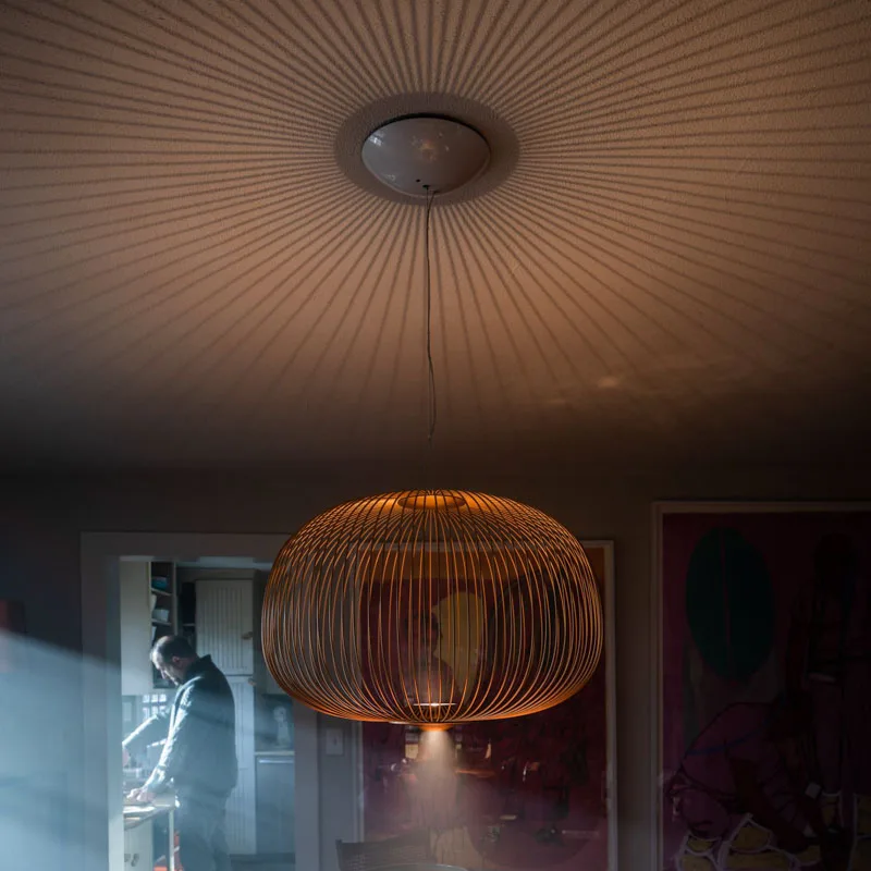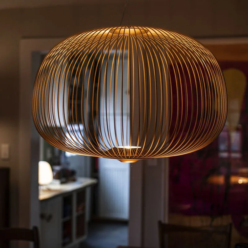 Egal ob über dem Esstisch oder als stimmungsvolles Raumlicht – Die LED-Pendelleuchte Spokes 3 projiziert ein faszinierendes Kaleidoskop aus leeren und vollen Flächen und setzt Wohn- oder Objektbereiche mit angenehmen warmweißen Licht in Szene. Dabei ist die Leuchte, die in ihrer Form an Volieren und antike orientalische Laternen erinnert und durch ihre weiche, sanfte Form beinahe schwerelos im Raum zu schweben scheint, der perfekte Ausdruck von Leichtigkeit und Bewegung.