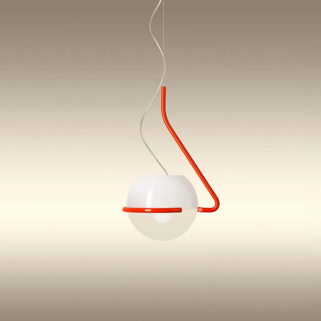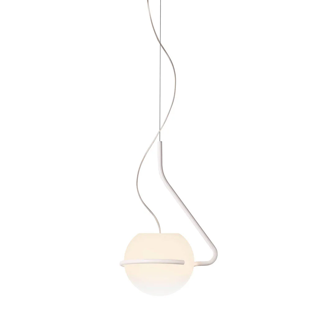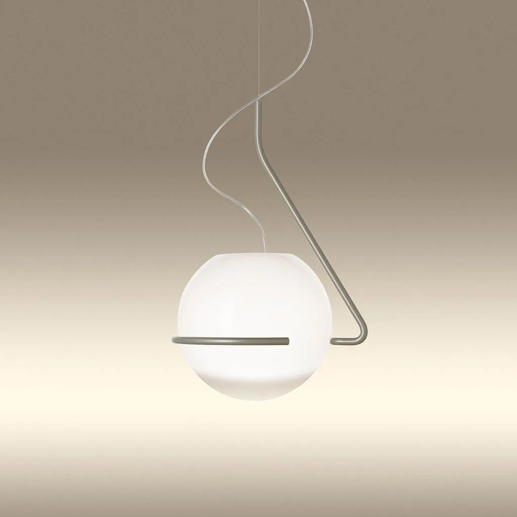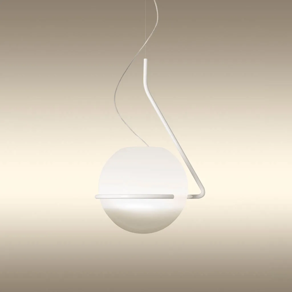 Die Foscarini Tonda Piccola Pendelleuchte präsentiert sich als kompaktere Variante der faszinierenden Pendelleuchte, die mit der Schwerkraft spielt. Entworfen vom Designer Ferruccio Laviani für den italienischen Hersteller Foscarini, vereint sie gewundene und geometrische Linien in einer eleganten Neuinterpretation des italienischen radikalen Designs der 60er-70er Jahre. Diese bemerkenswerte Lichtskulptur, die niemals gleich ist, besteht aus einer mundgeblasenen Opalglaskugel mit transparenter Schattierung, die auf einem seitlich versetzten Gestell aus farbigem Metall ruht. Die einzigartige Konstruktion schafft ein magisches Spiel mit dem Gleichgewicht, das den Betrachter fesselt.