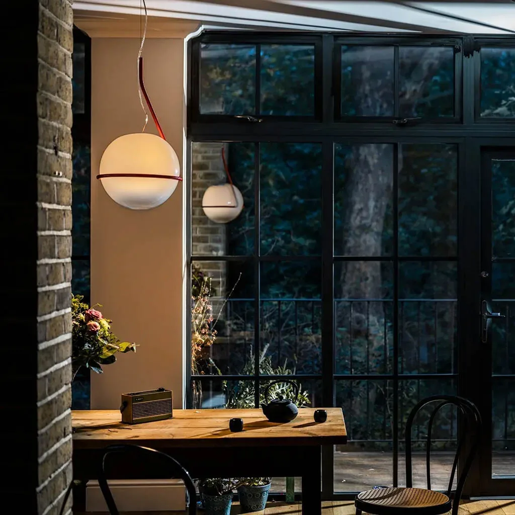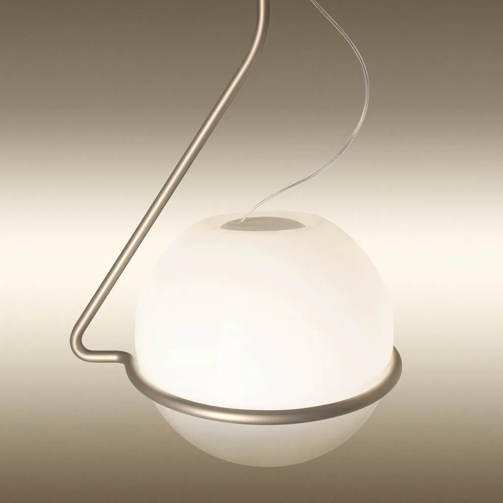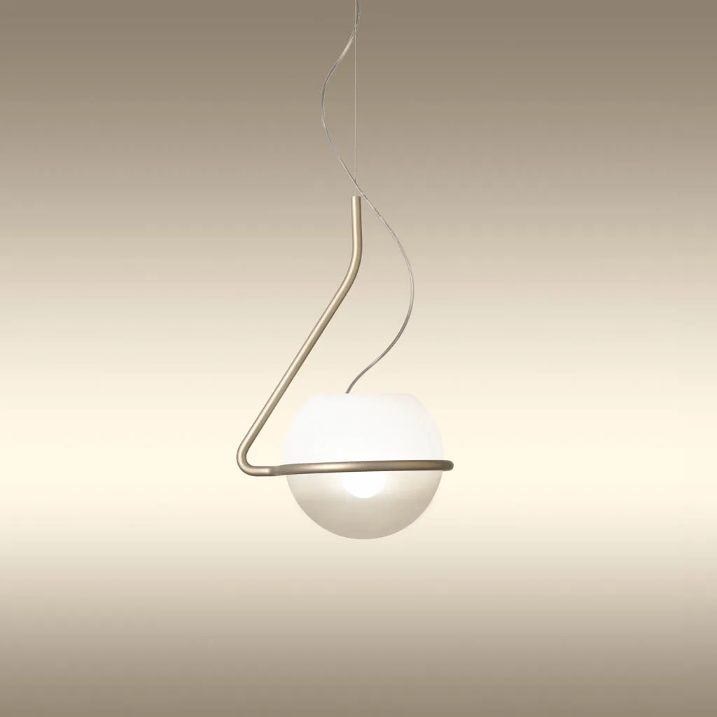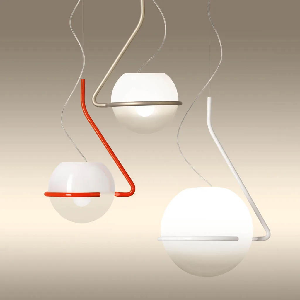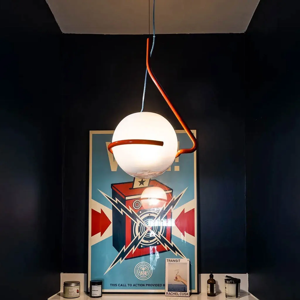 Die Foscarini Tonda Piccola Pendelleuchte präsentiert sich als kompaktere Variante der faszinierenden Pendelleuchte, die mit der Schwerkraft spielt. Entworfen vom Designer Ferruccio Laviani für den italienischen Hersteller Foscarini, vereint sie gewundene und geometrische Linien in einer eleganten Neuinterpretation des italienischen radikalen Designs der 60er-70er Jahre. Diese bemerkenswerte Lichtskulptur, die niemals gleich ist, besteht aus einer mundgeblasenen Opalglaskugel mit transparenter Schattierung, die auf einem seitlich versetzten Gestell aus farbigem Metall ruht. Die einzigartige Konstruktion schafft ein magisches Spiel mit dem Gleichgewicht, das den Betrachter fesselt.