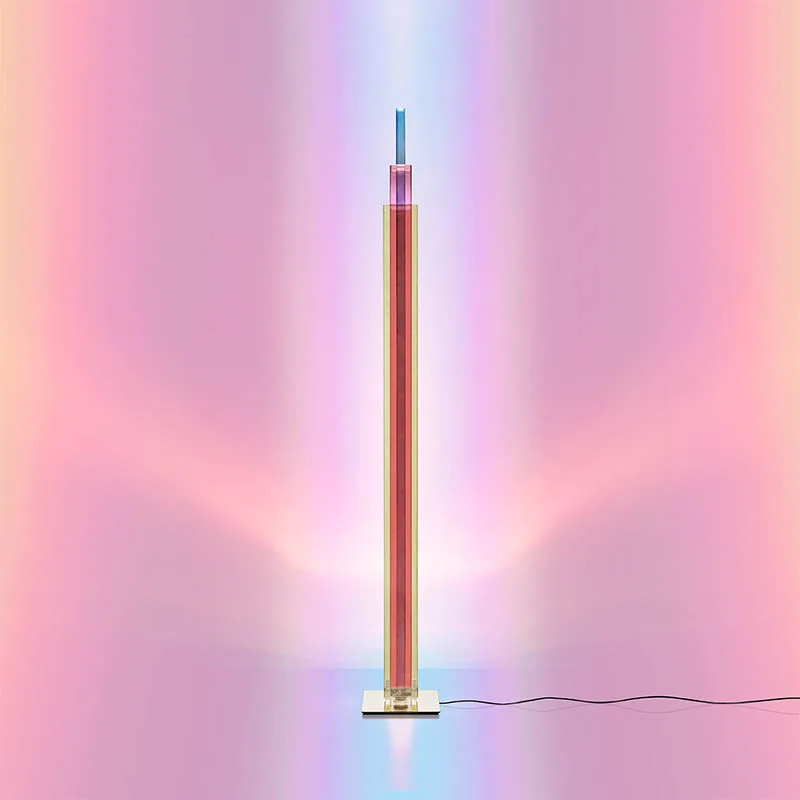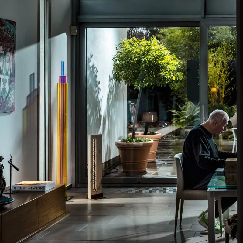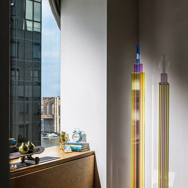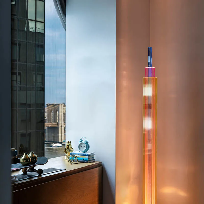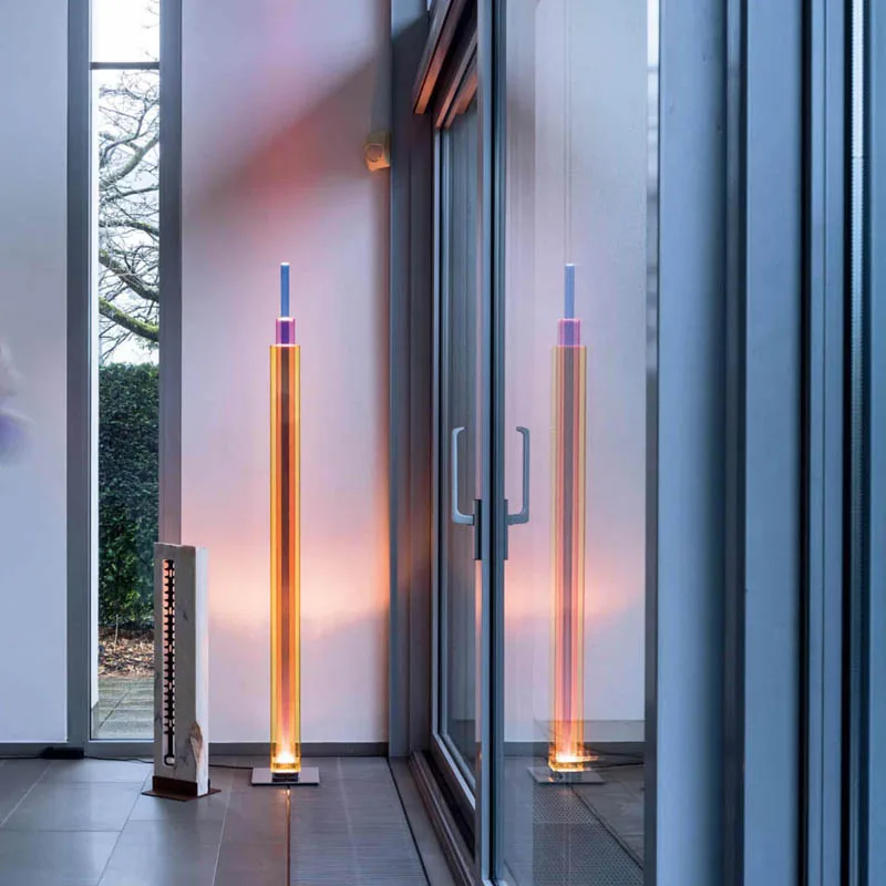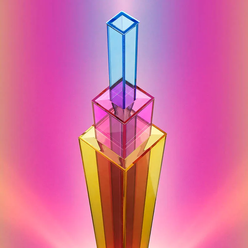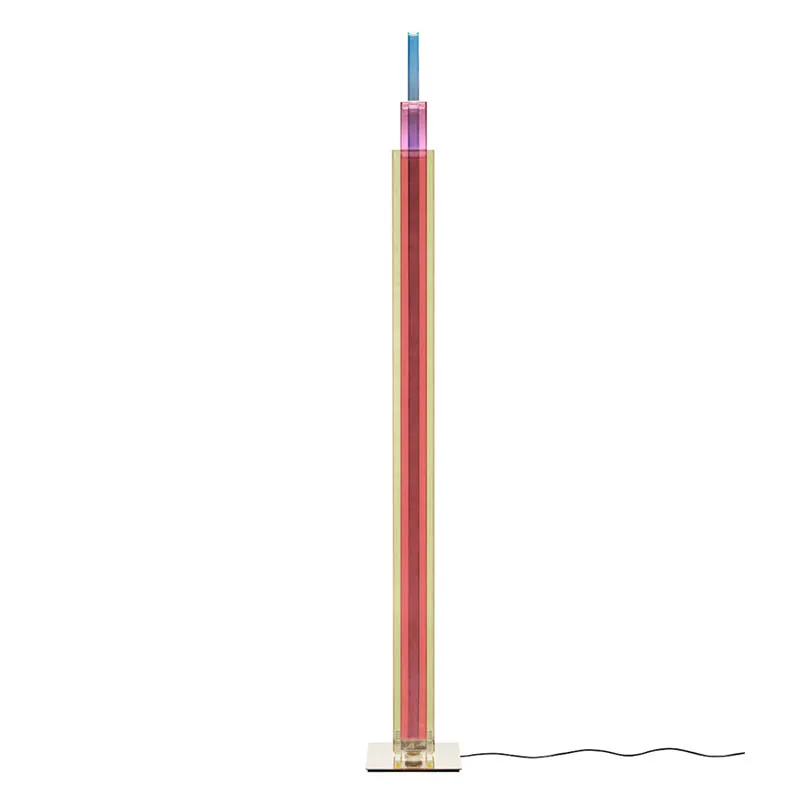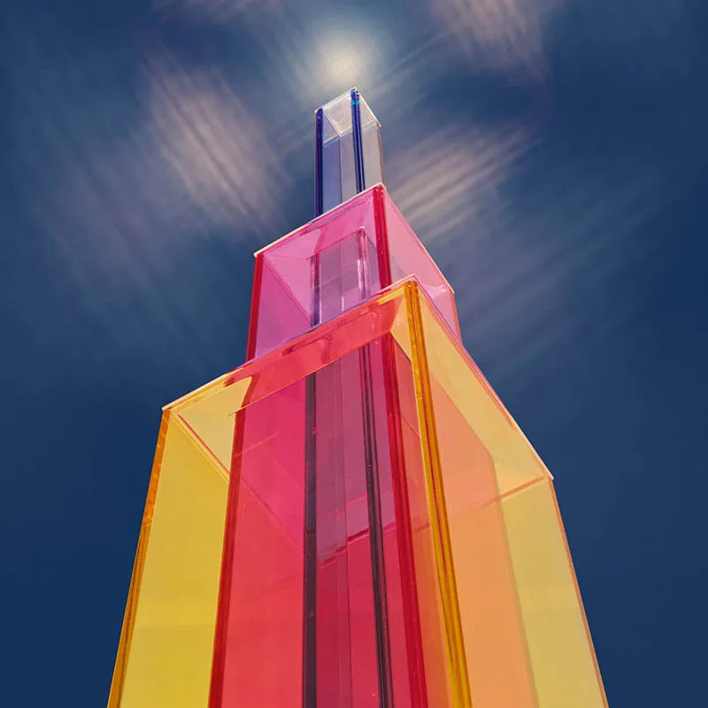 UpTown ist eine skulpturale Ode an die urbane Architektur – eine LED-Stehleuchte, die eine dynamische Choreografie aus Farben und Transparenzen in den Raum projiziert. Mit ihrem lebhaften und optisch beeindruckenden grafischen Design, das sich an den Ikonen der Wolkenkratzer in Großstädten orientiert, ist UpTown bereits im ausgeschalteten Zustand eine prägnante Präsenz im Raum. Eingeschaltet wird das Lichtobjekt zum absoluten Mittelpunkt. UpTown ist ein Meisterwerk der Lichtkunst, bestehend aus drei Schichten von farbigen Glasplatten in den Farbtönen Gelb, Magenta und Blau.