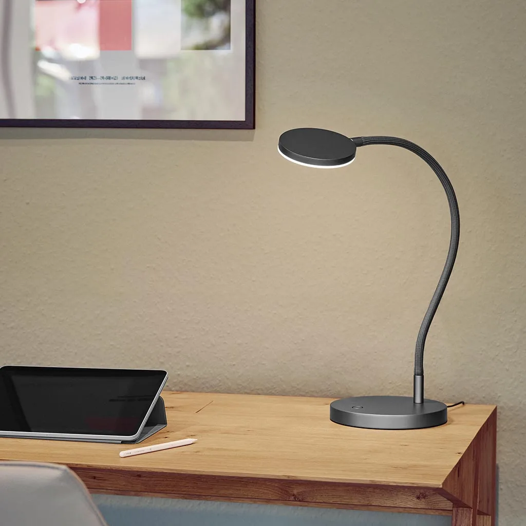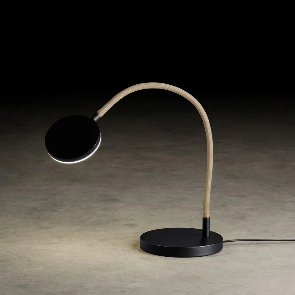 Moderne LED-Leseleuchte mit flexiblem Leuchtenarm und schwenkbaren Leuchtenkopf. Vielfältige Kombinationsmöglichkeiten von Oberflächen und textil ummantelten Schläuchen. Brillante Farbwiedergabe. Tastdimmer mit Memory-Funktion.