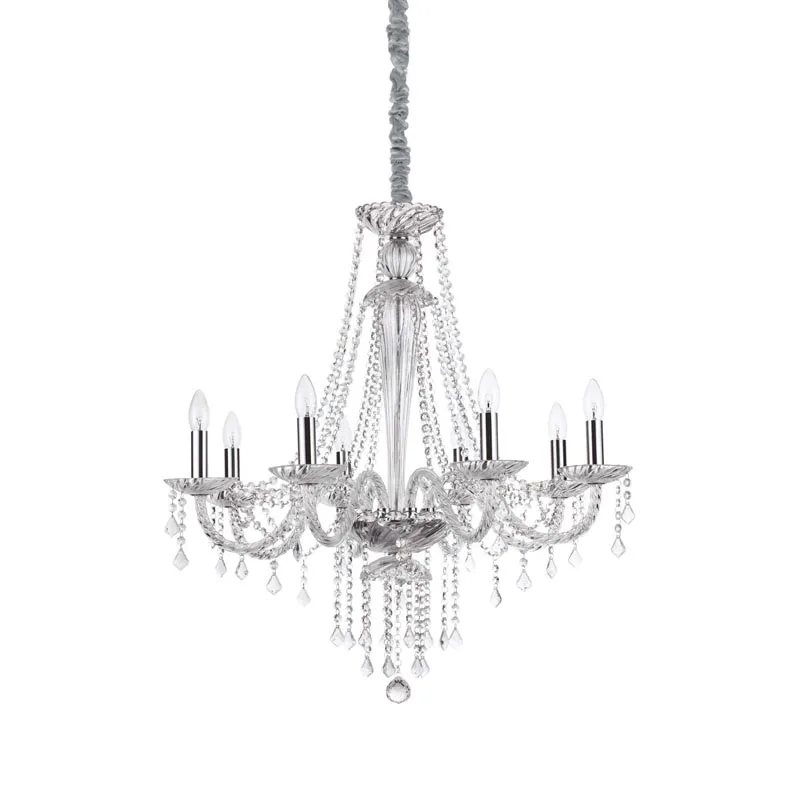 Der 8-flammige Kronleuchter Amadeus vereint klassische Eleganz und modernen Luxus. Das Gestell und der Baldachin aus chromfarbenem Metall verleihen ihm eine glänzende Präsenz und eine zeitgenössische Note, während die Verzierungen aus geblasenem Glas und präzise geschliffenem Kristall ihm eine unvergleichliche Opulenz und ein funkelndes Lichtspiel verleihen.