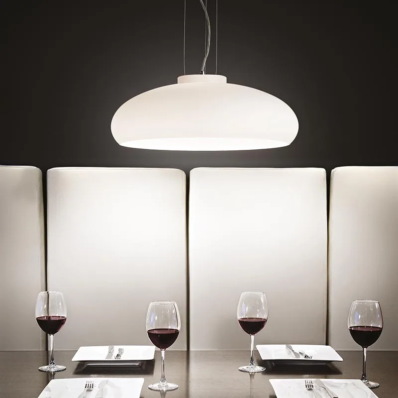 Die Ideal Lux Aria Pendelleuchte verbindet Funktionalität mit zeitloser Eleganz. Mit ihrem sanft geschwungenen Diffusor aus weißem, geblasenem und geätztem Glas bietet die Aria eine zauberhafte Lichtquelle, die sich perfekt über Esstische oder Kochinseln in Wohnräumen und der Gastronomie einfügt.