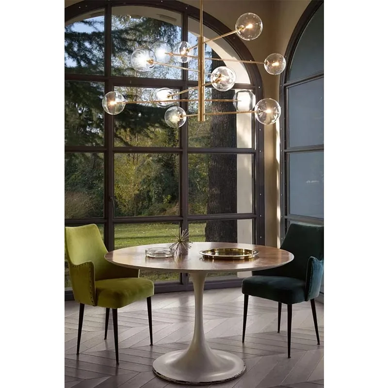 Die Anordnung der Glaskugeln rund um das Gestell schafft ein gleichmäßiges und doch lebendiges Muster, das für visuelle Balance und eine dynamische Lichtverteilung sorgt. Die Transparenz der Diffusoren sorgt für einen ungehinderten Lichtfluss und eine Atmosphäre, die sowohl einladend als auch weitläufig ist.