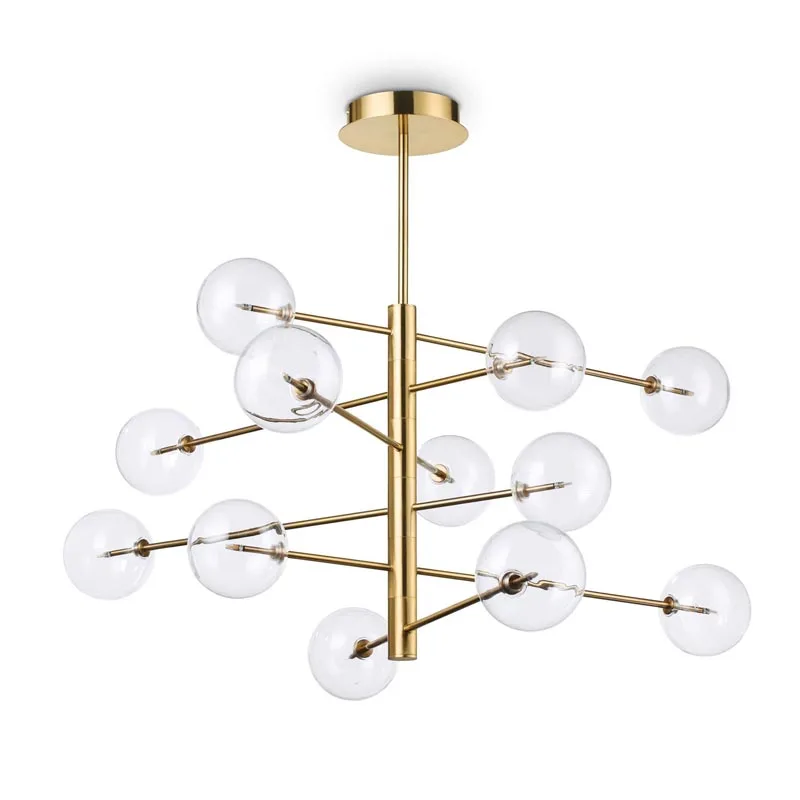 Das Design der Equinoxe ist eine Hommage an geometrische Perfektion und Komplexität. Ausgehend von einem zentralen Punkt, entfalten sich mehrere Arme in unterschiedlichen Winkeln und tragen an ihren Enden transparente Diffusoren, die aus klarem, geblasenem Glas hergestellt sind und das Licht auf elegante Weise im Raum verteilen.