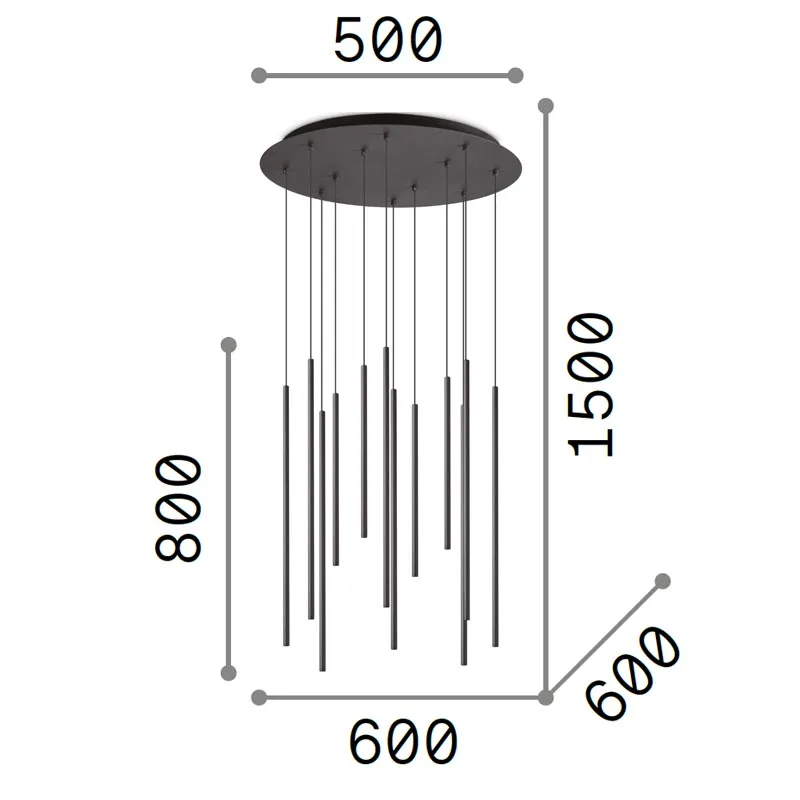 Die Ideal Lux Filo SP12 LED-Pendelleuchte ist eine Komposition aus Eleganz und moderner Beleuchtungstechnik. Bestehend aus 12 filigranen Pendeln, kreiert diese Leuchte ein eindrucksvolles Lichtspiel, das an einen sanften Lichtregen erinnert.