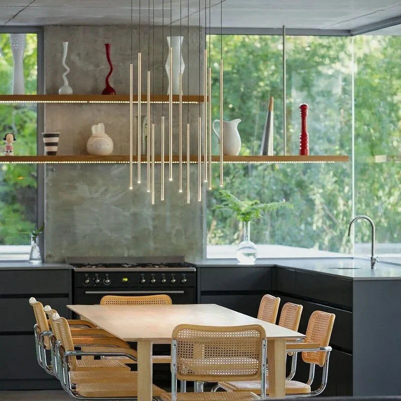 Jedes Pendel hängt an einem schlanken, schwarzen PVC Elektrokabel und endet in einer zylindrischen Leuchte aus pulverbeschichtetem oder plattiertem Metall, verfügbar in den Ausführungen Schwarz oder satiniertes Messing. Diese Farbvarianten ermöglichen eine perfekte Abstimmung auf unterschiedliche Interieur-Designs, von modern bis klassisch.