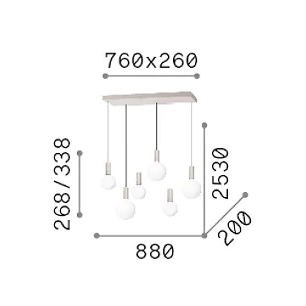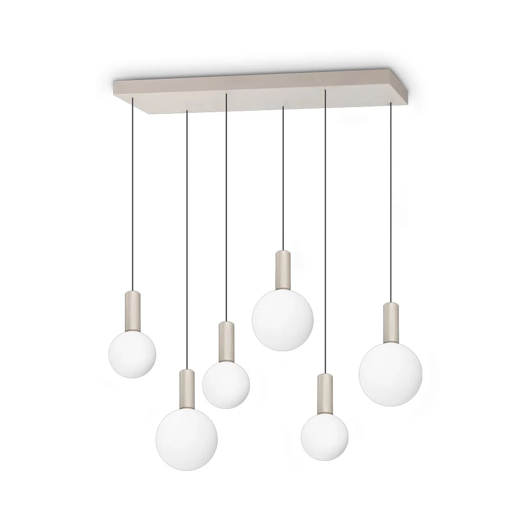 Die Ideal Lux Odeon SP6 Linear LED-Pendelleuchte überträgt das charakteristische Odeon-Design in eine klare, lineare Anordnung. Sechs kugelförmige Leuchten sind in unterschiedlichen Abhängungen entlang einer rechteckigen Deckenrosette positioniert und bilden eine ruhige, ausgewogene Lichtlinie mit architektonischer Wirkung. Das Ergebnis ist ein modernes, stilvolles Erscheinungsbild, das Struktur und Leichtigkeit harmonisch vereint.