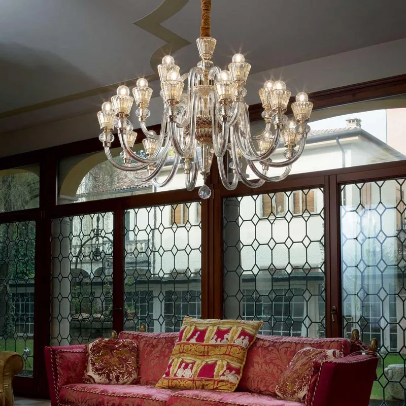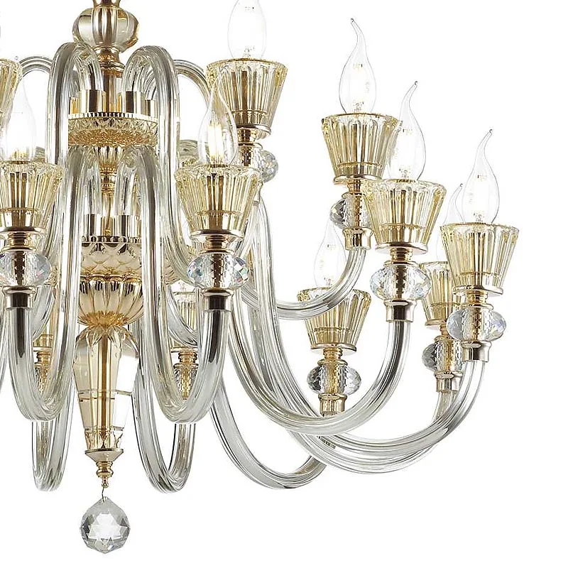 Strauss SP18 ist ein opulenter Kronleuchter, der mit seinen 18 Flammen eine luxuriöse Atmosphäre schafft. Das Gestell und die Details, in einem reichen Goldton ausgeführt, verleihen diesem Kronleuchter einen erlesenen Glanz, der jedes Interieur erhellt und veredelt. Die Arme, aus transparentem, geblasenem Glas gefertigt, fügen eine hauchzarte Eleganz hinzu, die das goldene Metall mit einer sanften Leichtigkeit kontrastiert.
