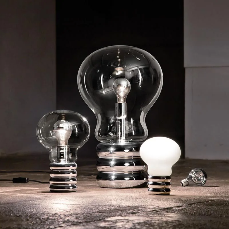 Design: Ingo Maurer 1966 „Bulb” ist das Abbild einer riesigen Glühbirne. Der mundgeblasene Kristallglaskörper sitzt auf einem hochglanzverchromten Metallsockel, der die Fassung einer Allgebrauchslampe darstellt. Die kopfverspiegelte Glühlampe ist im Lieferumfang enthalten.