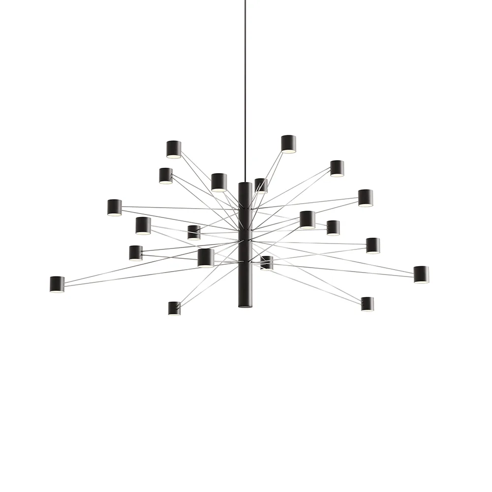 20 LED-Lichtquellen sitzen an filigranen Metallarmen, die sich kreisförmig um eine zentrale Achse gruppieren. Die Arme sind individuell montierbar und schaffen so modulare, fast skulpturale Kompositionen, die sich an jede Raumsituation anpassen lassen – von der modernen Hotellobby bis zum kreativen Wohnloft.
