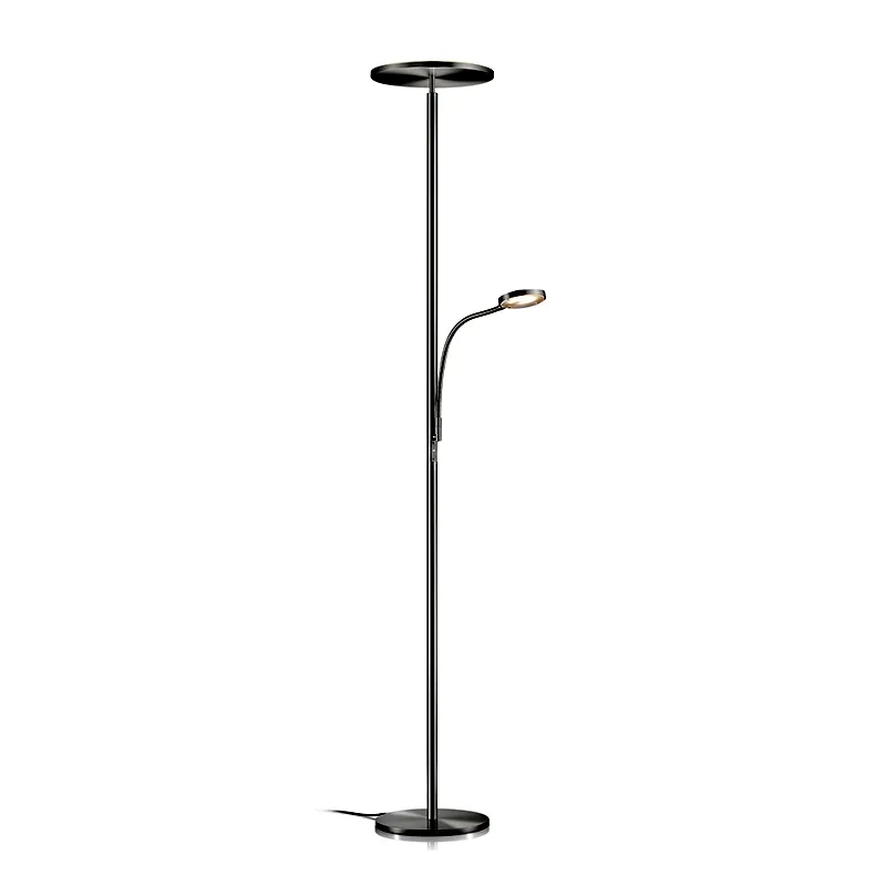 Aura L – moderner und innovativer LED-Deckenfluter mit zusätzlichem Leselicht und Gestensteuerung. Erhältlich in Schwarz oder mattnickel.