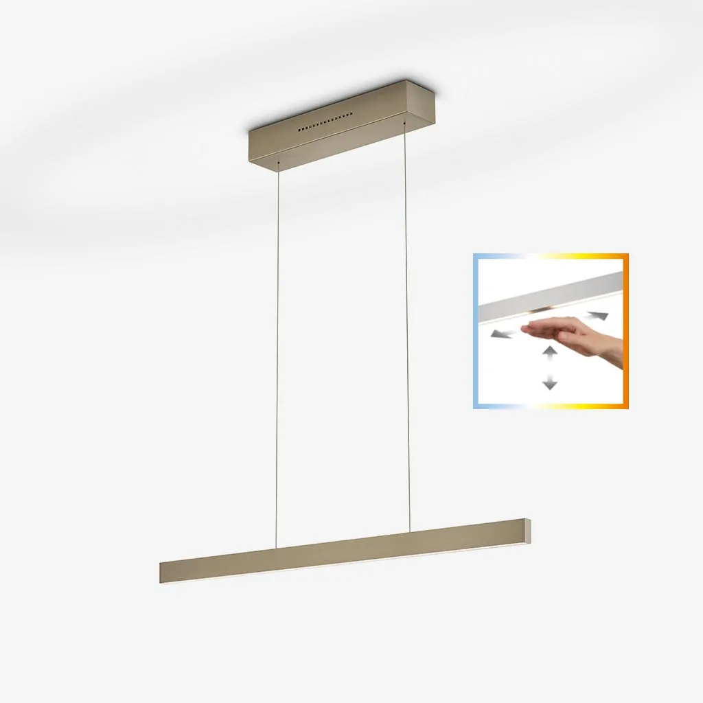 Lineare LED-Pendelleuchte für Konferenztische, Esstische, Tresen oder Arbeitstische ✓ stufenlose Höhenverstellung ✓ Brillantes Ober- und Unterlicht über Gestensteuerung getrennt schalt- und dimmbar ✓ Dynamic White Steuerung, Lichtfarbe 2.200 – 3.000 Kelvin ✓ Memory Funktion