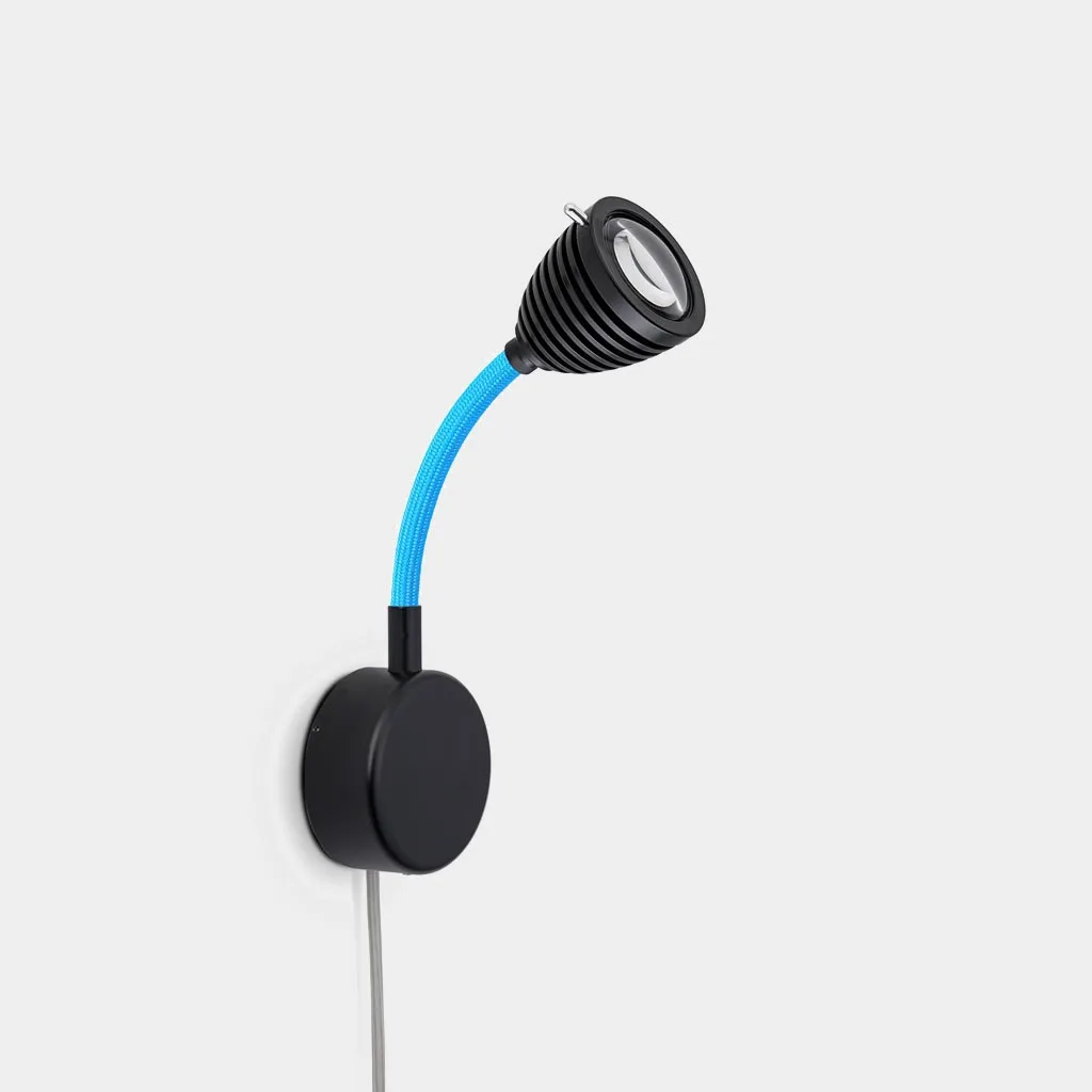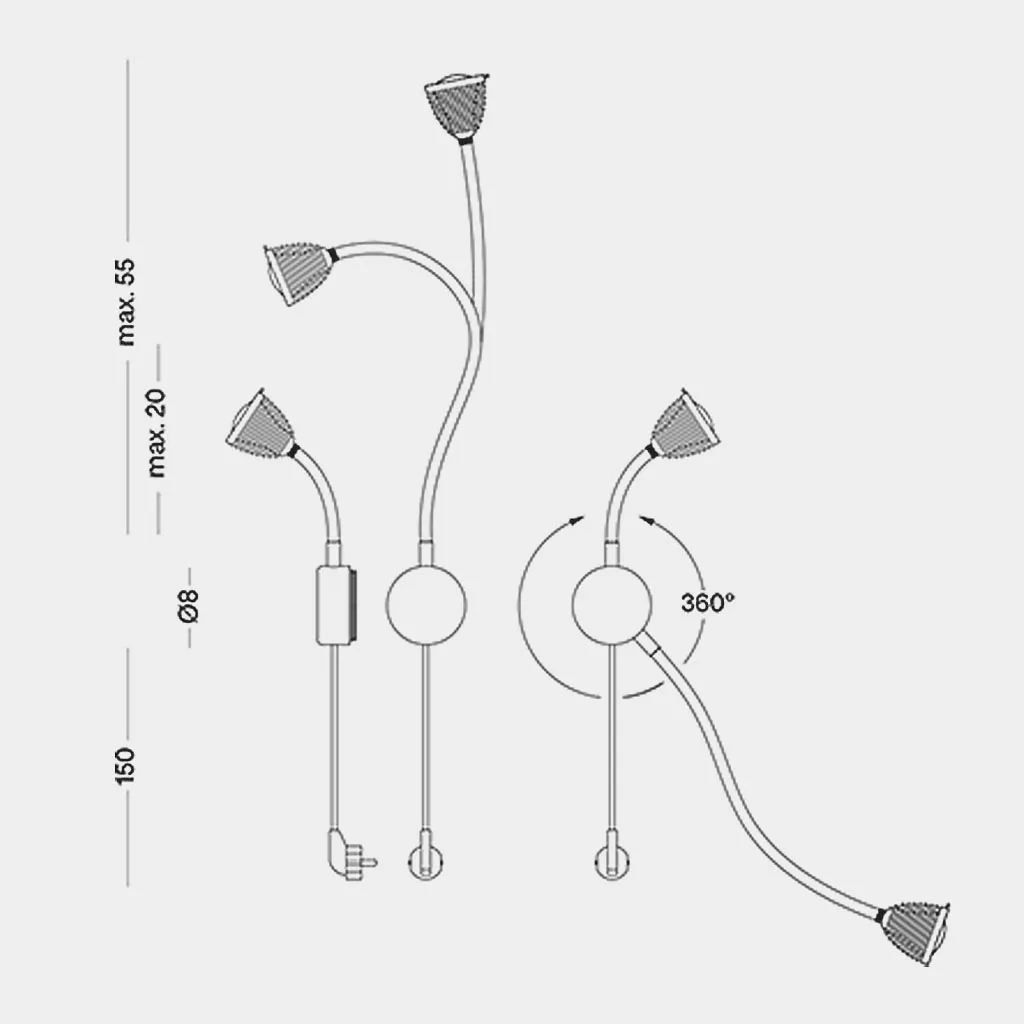 Der flexible Leuchtenarm, optional in attraktiven Textilvarianten, ermöglicht eine exakte Ausrichtung des Lichtkegels. Der massive Aluminiumsockel ist um 360° drehbar und erlaubt eine freie Wahl des Kabelausgangs, was eine einfache Anpassung an verschiedene Installationssituationen ermöglicht.