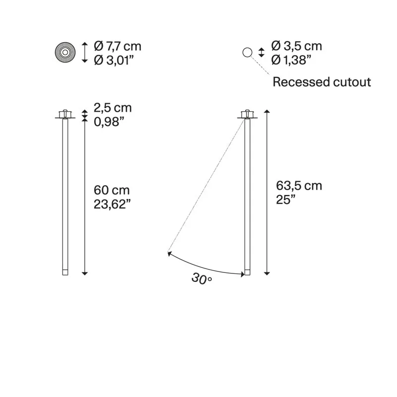 Am unteren Ende befindet sich ein transparenter Methacrylat-Diffusor, der das LED-Licht gleichmäßig streut. Der Lichtpunkt wirkt dabei fast schwerelos und erzeugt eine sanfte, blendfreie Beleuchtung. Dank des schwenkbaren Gelenks lässt sich der Lichtstrahl um bis zu 30° neigen, wodurch gezielte Akzente gesetzt oder größere Flächen stilvoll beleuchtet werden können.