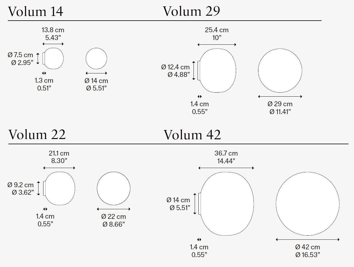 Ausgestattet mit einer E14 oder E27 Fassung lässt sich Volum mit modernen und energieeffizienten LED-Lampen bestücken.  Die neue Version für die Wand und Decke ist mit der Schutzklasse IP 54 realisiert, die den Schutz vor äußeren Einflüssen wie Staub oder Spritzwasser garantiert und so auch einen Einsatz in feuchten Umgebungen, wie z. B. in einem Badezimmer oder Spa, ermöglicht. Über einen externen TRIAC-Dimmer lässt sich die Lichtintensität an persönliche Lichtbedürfnisse anpassen.