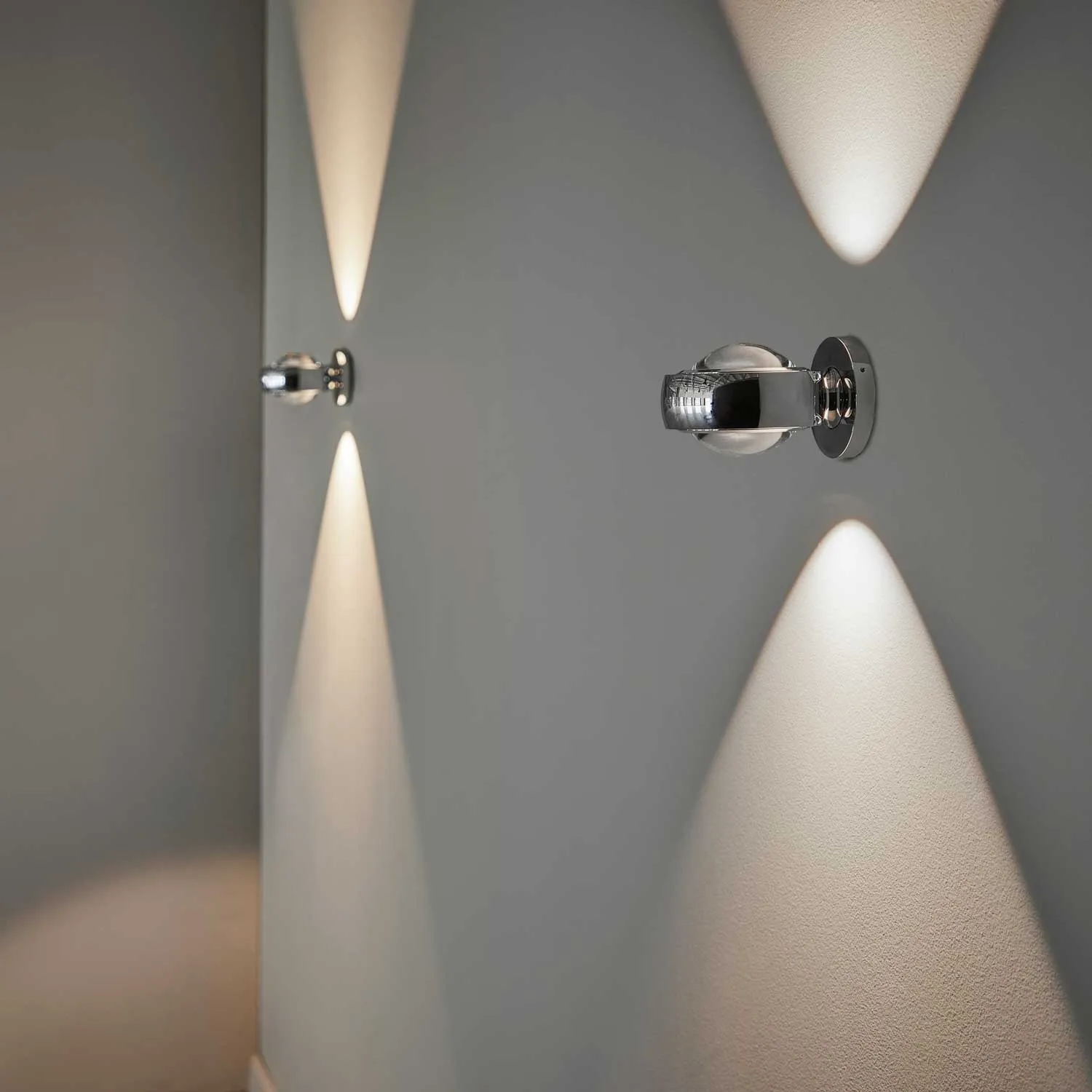 Die Optic Chrome ist eine elegante Wandleuchte, die durch klare Linsen wunderschöne Lichtbögen nach oben und unten ausstrahlt. Ihr 90-Grad-Strahlwinkel trägt zu diesem Effekt bei und schafft eine fantastische Atmosphäre, die den Raum erhellt. Der integrierte Verstellstift ermöglicht eine einfache Anpassung der Lichtausrichtung, was die Leuchte zu einer flexiblen und stilvollen Wahl für jedes moderne Innendesign macht.
