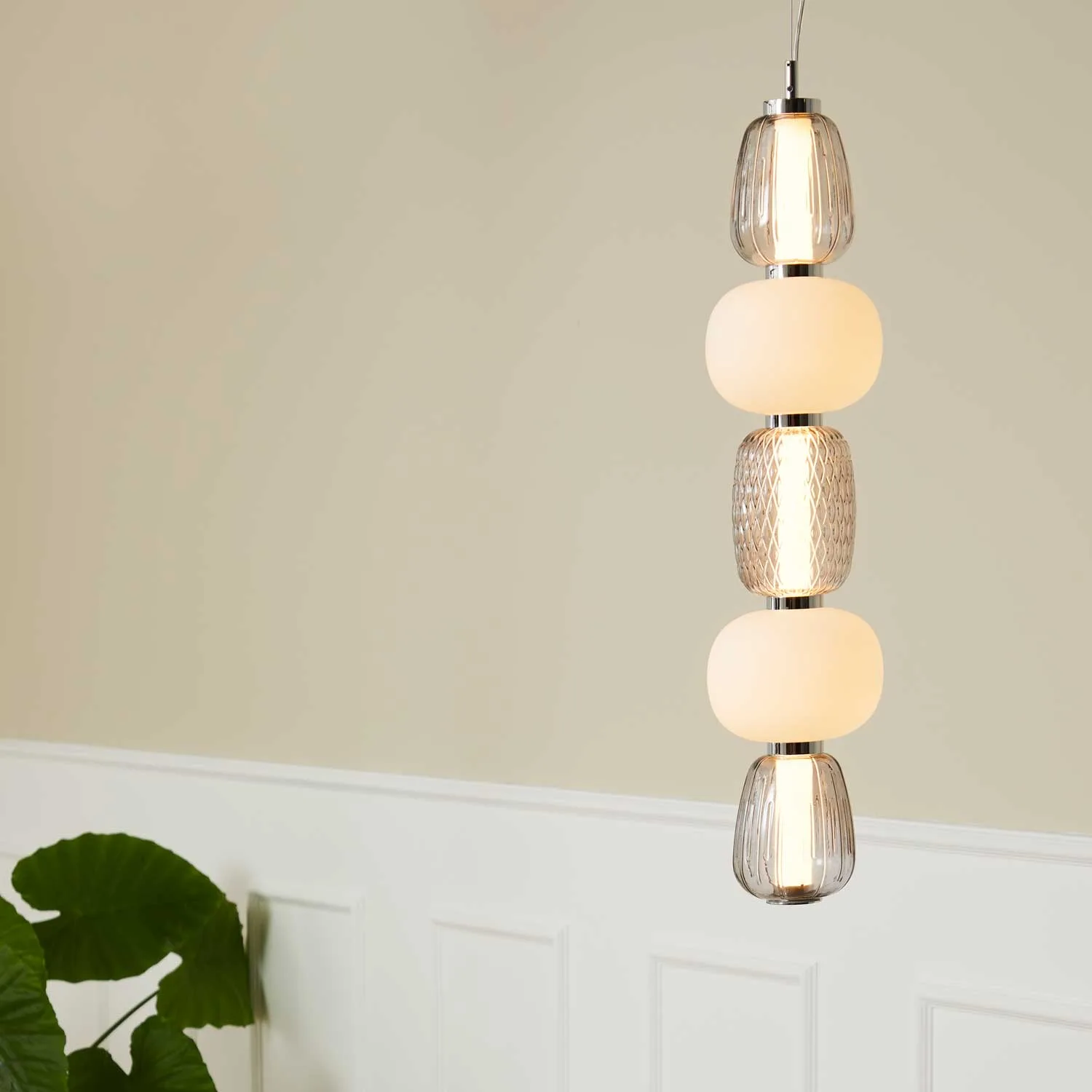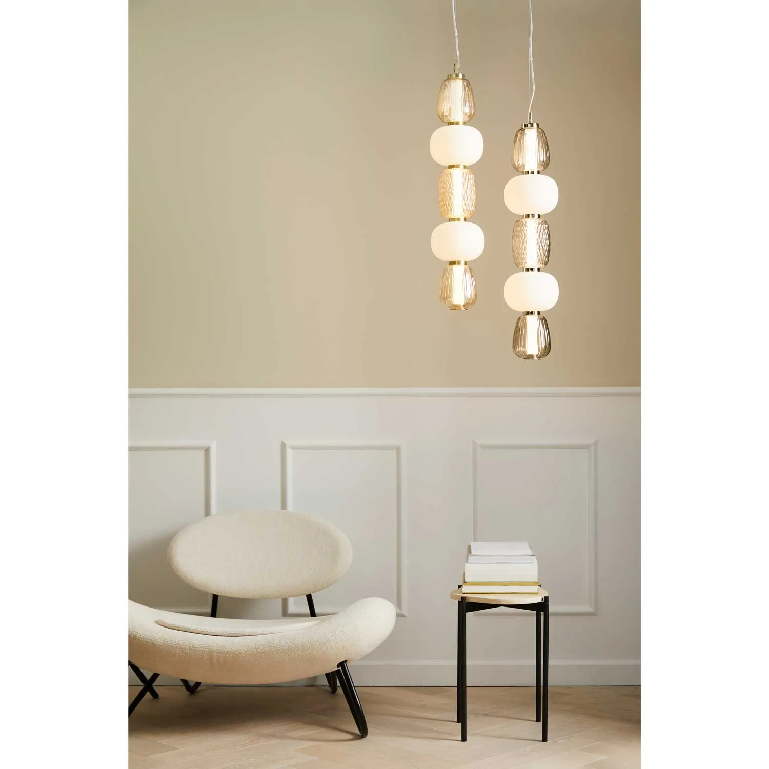 Wie eine strahlende Perlenkette präsentiert sich die vertikale LED-Pendelleuchte Pearl 5 des Herstellers LOOM Design. Dekorativ, exklusiv und klassisch in ihrer Erscheinung, wird die außergewöhnliche Leuchte zum Blickfang in jedem Raum. Diese meisterhaft gestaltete Hängeleuchte besteht aus unterschiedlich großen Diffusoren aus mundgeblasenem Glas, ergänzt durch Zwischenringe in glänzendem Chrom oder mattem Gold. Ausgestattet mit hochwertigen LEDs, bietet Pearl 5 nicht nur angenehmes warmweißes Licht, sondern kreiert durch die strukturierten Glasdiffusoren einzigartige Lichteffekte.