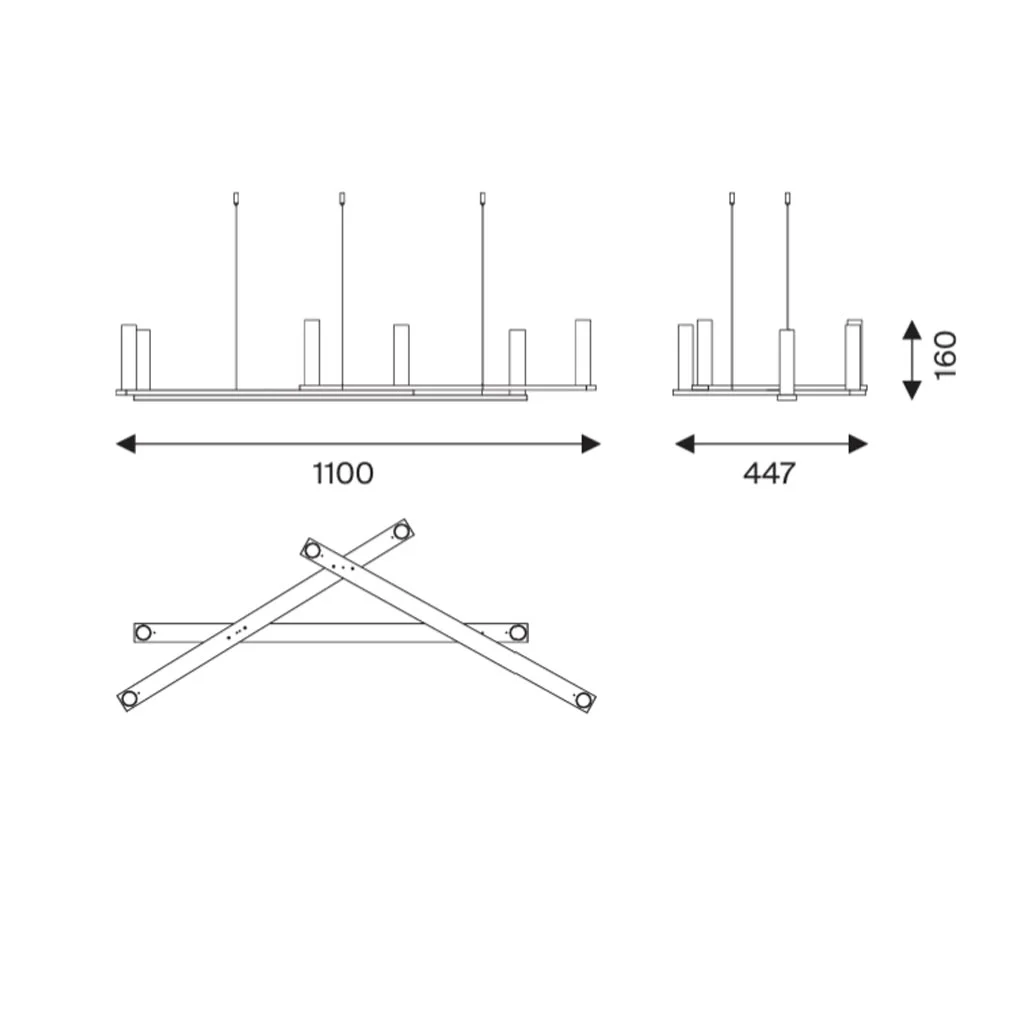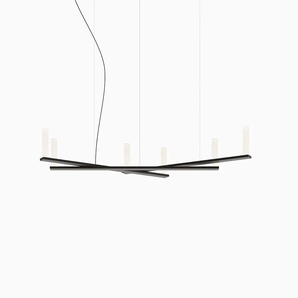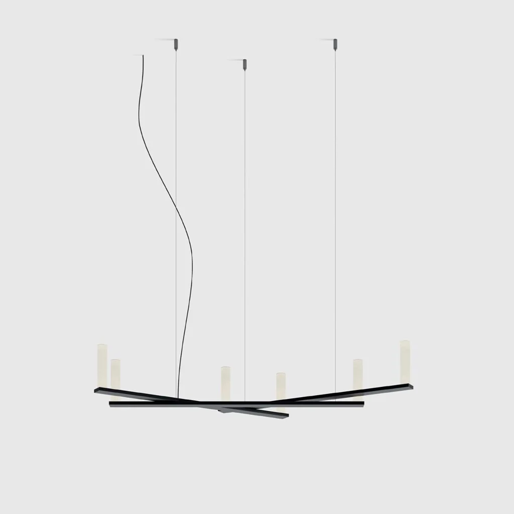Die Dix Bougies Petite Pendelleuchte von Luceplan ist ein ausdrucksstarkes Lichtobjekt, das technische Präzision mit poetischer Leichtigkeit verbindet. Ihre Konstruktion basiert auf einer langen, horizontalen Aluminiumstruktur, die von mehreren weiteren Elementen gekreuzt wird – asymmetrisch, scheinbar zufällig und zugleich perfekt ausbalanciert.