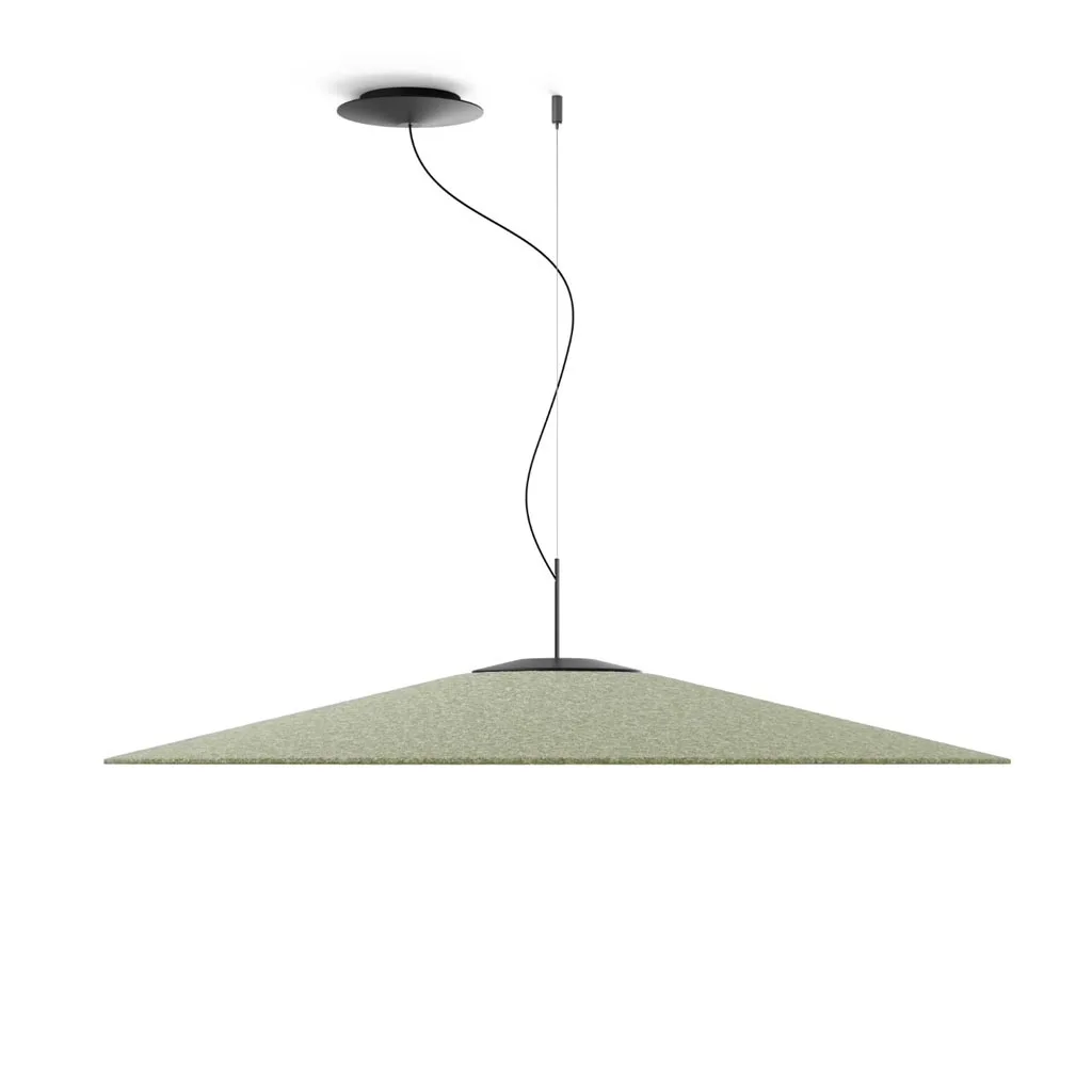 Der imposante Reflektor besteht aus einer hochwertigen Filzkappe mit 60 % Recyclinganteil. Dieser Filz verleiht der Leuchte nicht nur eine weiche, textile Ausstrahlung, sondern verbessert durch die Reduktion der Nachhallzeit spürbar den akustischen Komfort im Raum. So entsteht selbst in großen oder halligen Umgebungen eine angenehm ausgewogene Klangatmosphäre – ideal für offene Wohnkonzepte, Loft-Wohnungen, offene Küchen, Restaurants, Hotellobbys, Konferenzbereiche oder weitläufige Open-Space-Büros.