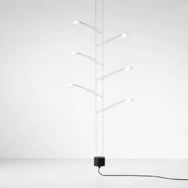 Die Grundstruktur besteht aus elektrifizierten Stahlseilen, die vom Boden bis zur Decke geführt und durch ein Gegengewicht permanent auf Spannung gehalten werden. An diesen Seilen lassen sich die filigranen Leuchtenkörper mithilfe zweier leichter Arme befestigen. Diese tragen jeweils den kompakten Leuchtenkopf und enden in einer feinen Spirale – ein funktionales Detail mit skulpturalem Charakter.