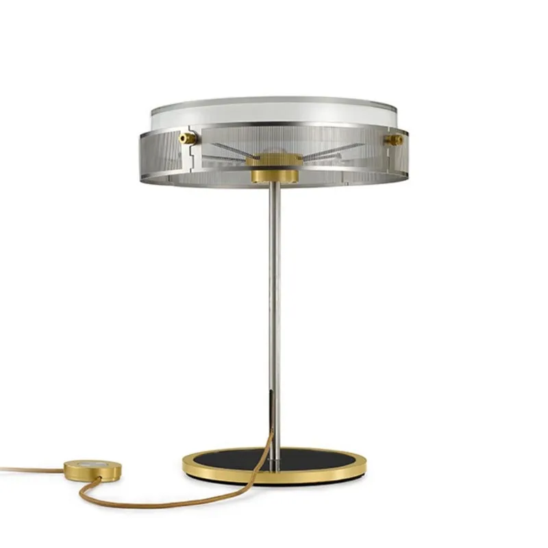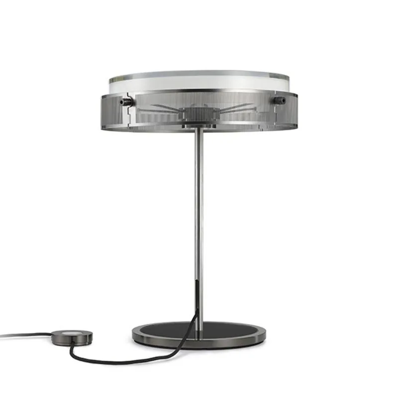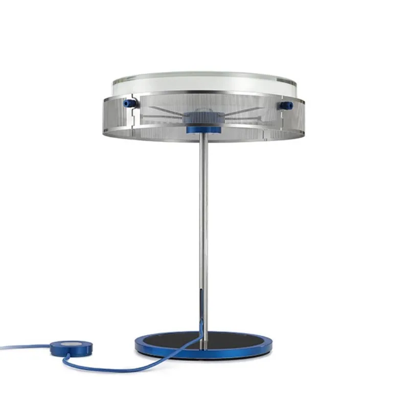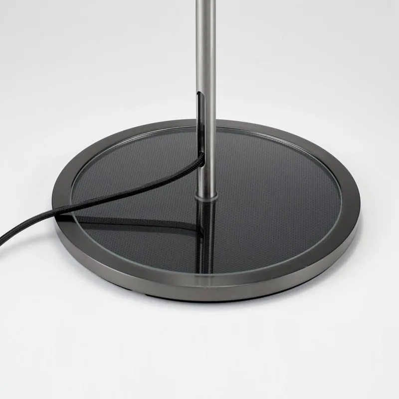 Der Stiel aus gebürstetem Edelstahl präsentiert stolz das farbige Stoffkabel, das geschickt im Inneren geführt wird. Die Basis aus transparentem Glas wird von einem farbigen Metallring eingefasst und unterstreicht das raffinierte Design der Lampe.